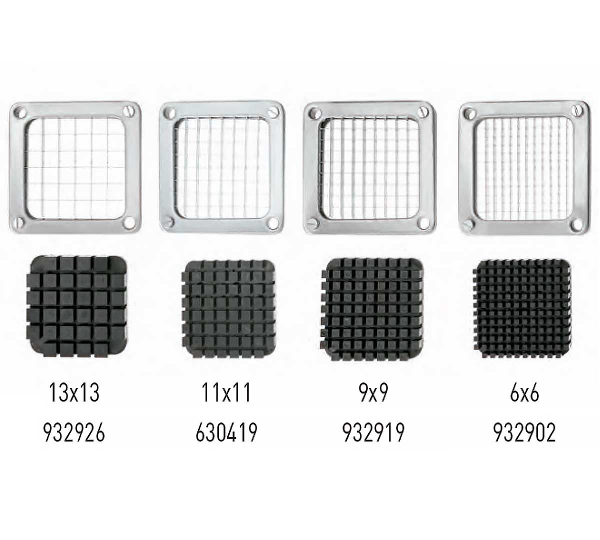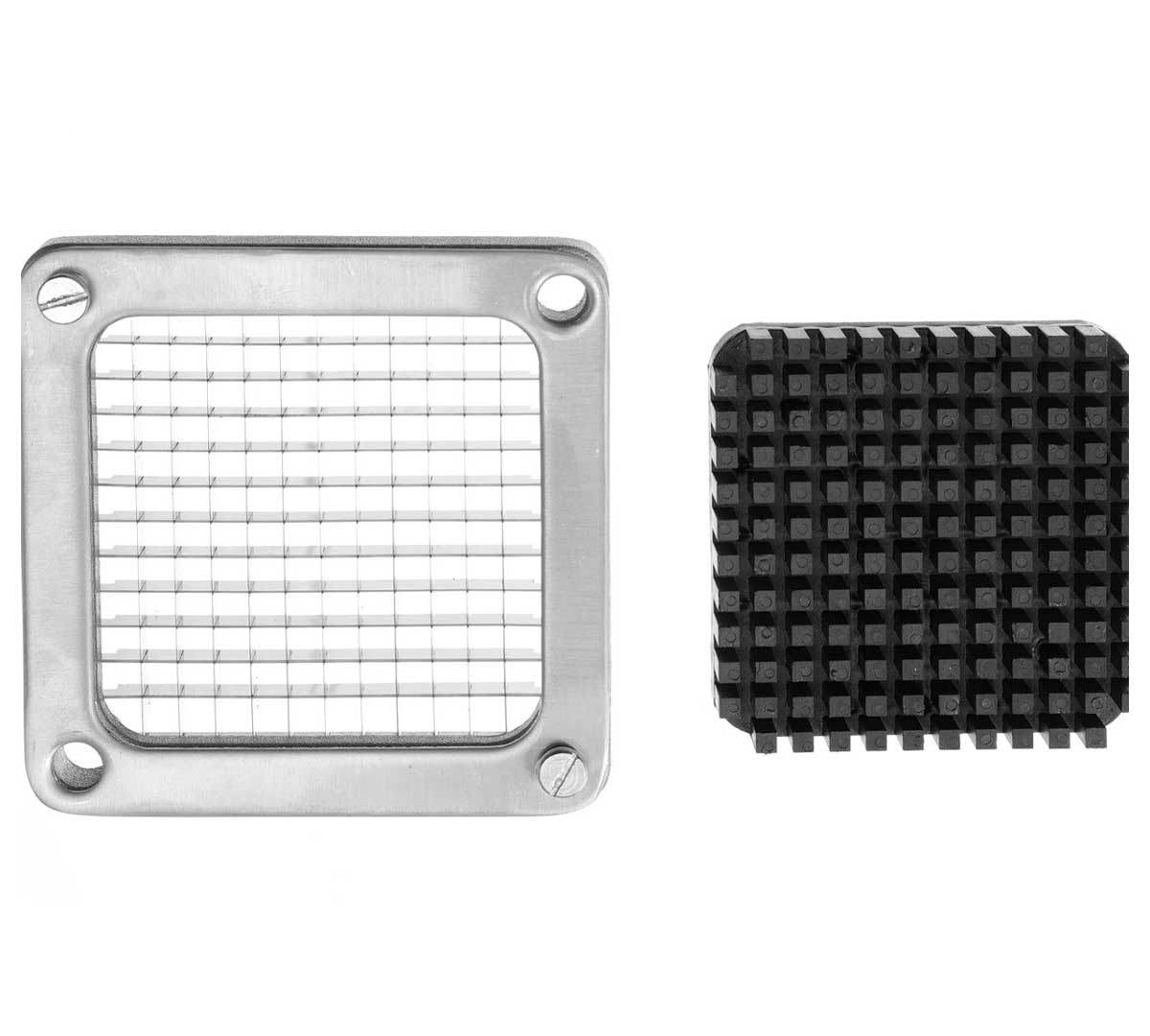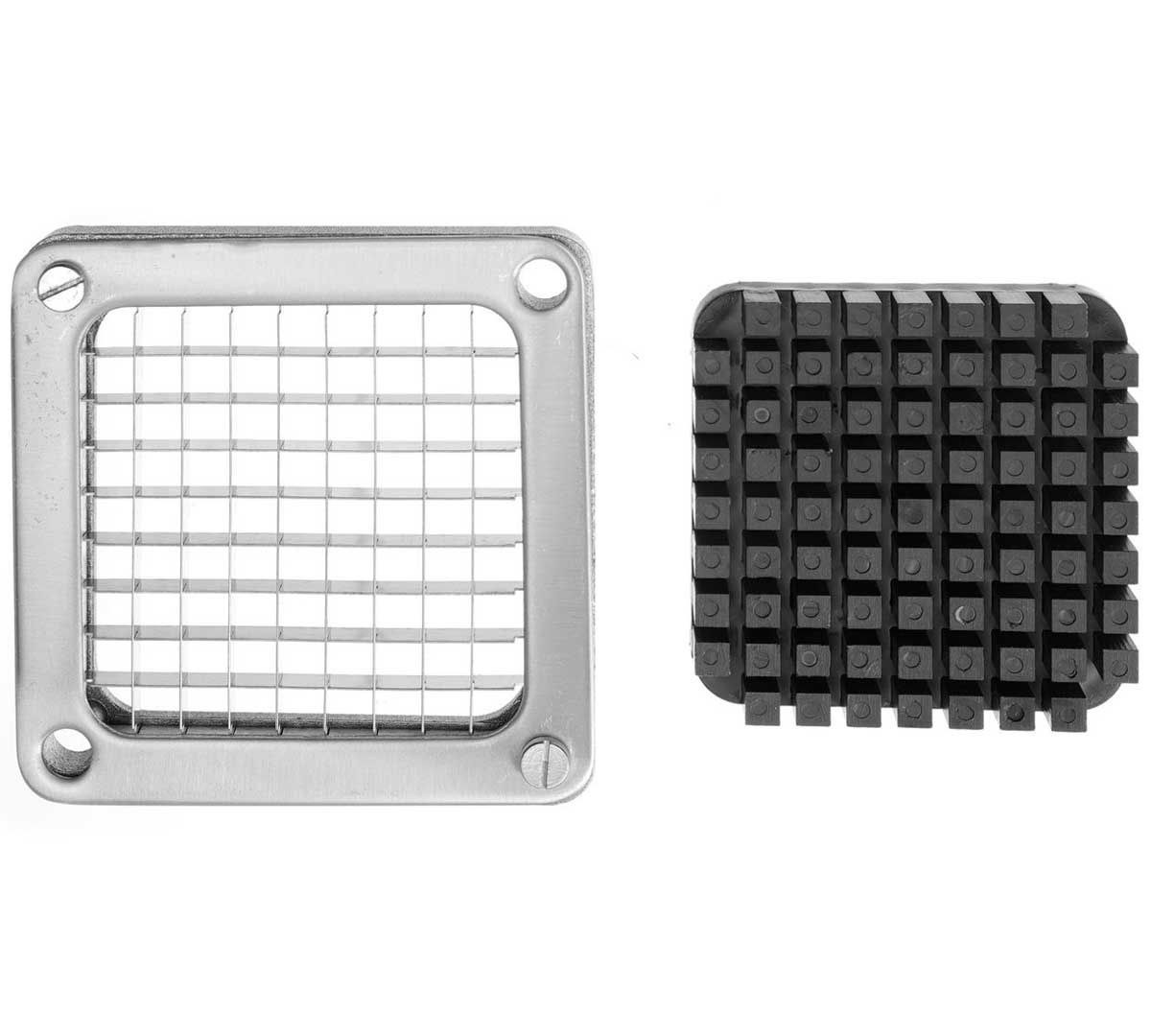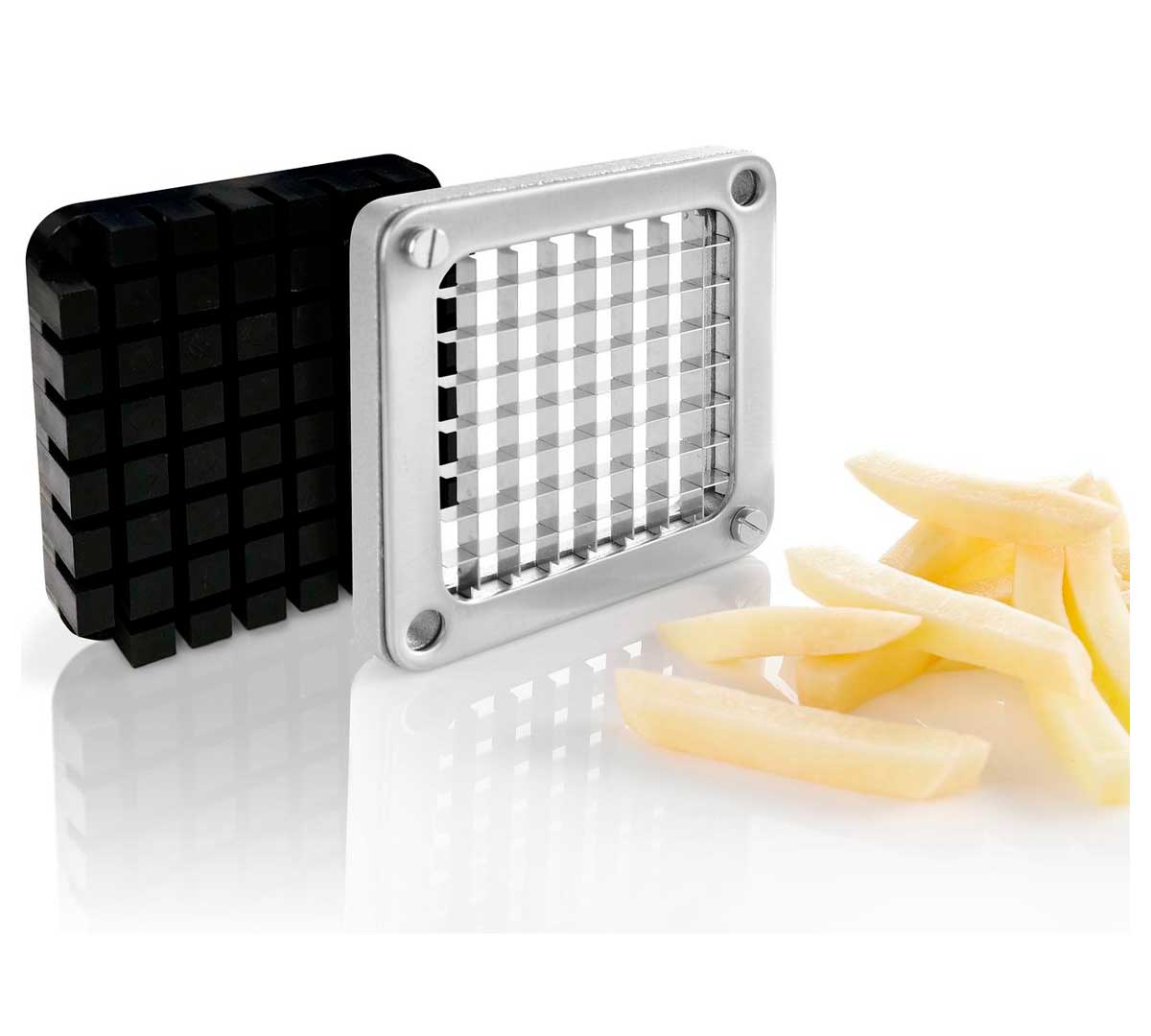 Cuchillas de acero inoxidable para corte preciso de patatas fritas. Incluyen placa de presión para una mayor facilidad de uso y mejor resultado en el corte. Es compatible con el Cortador de Patatas Fritas de Hendi.