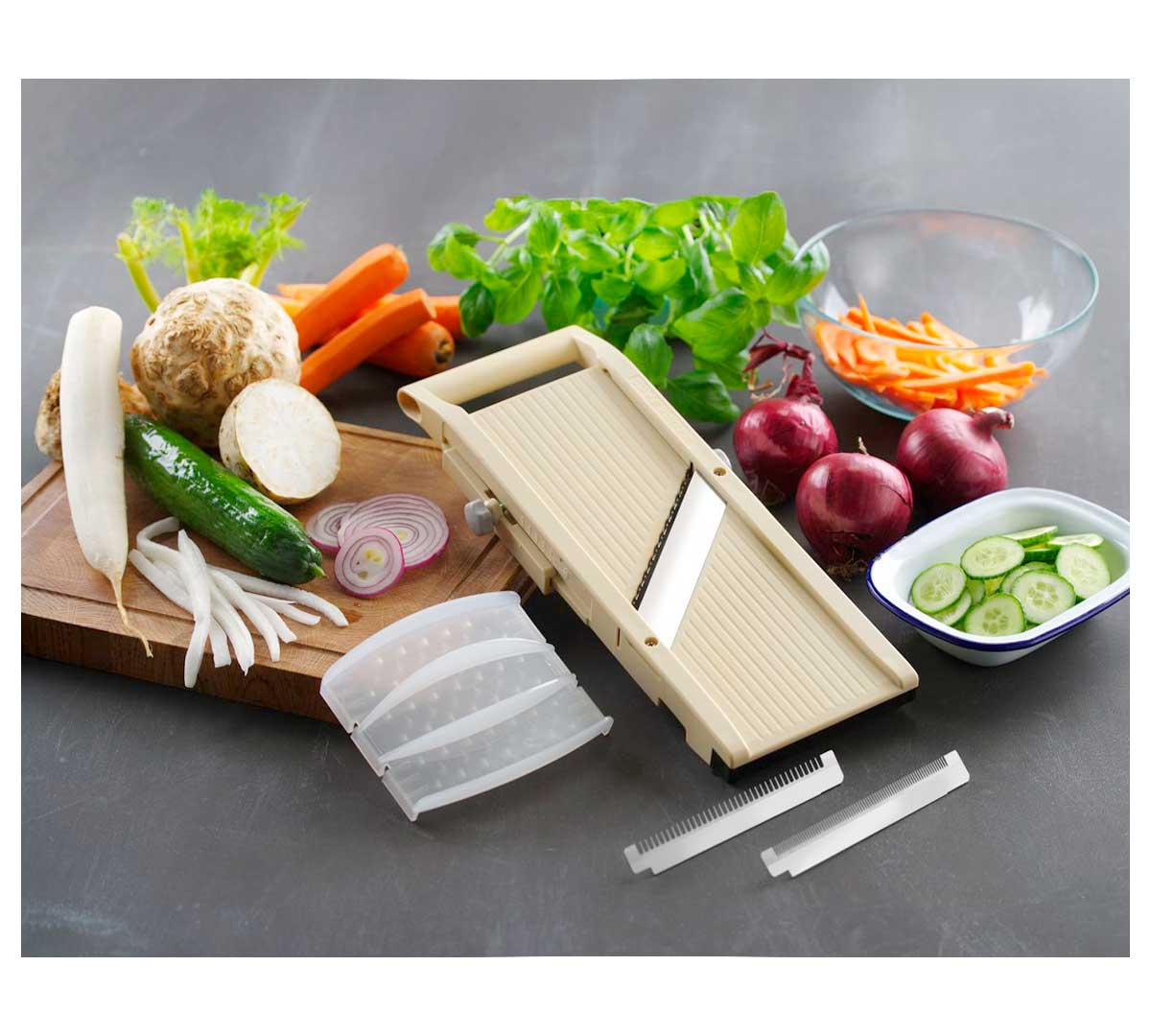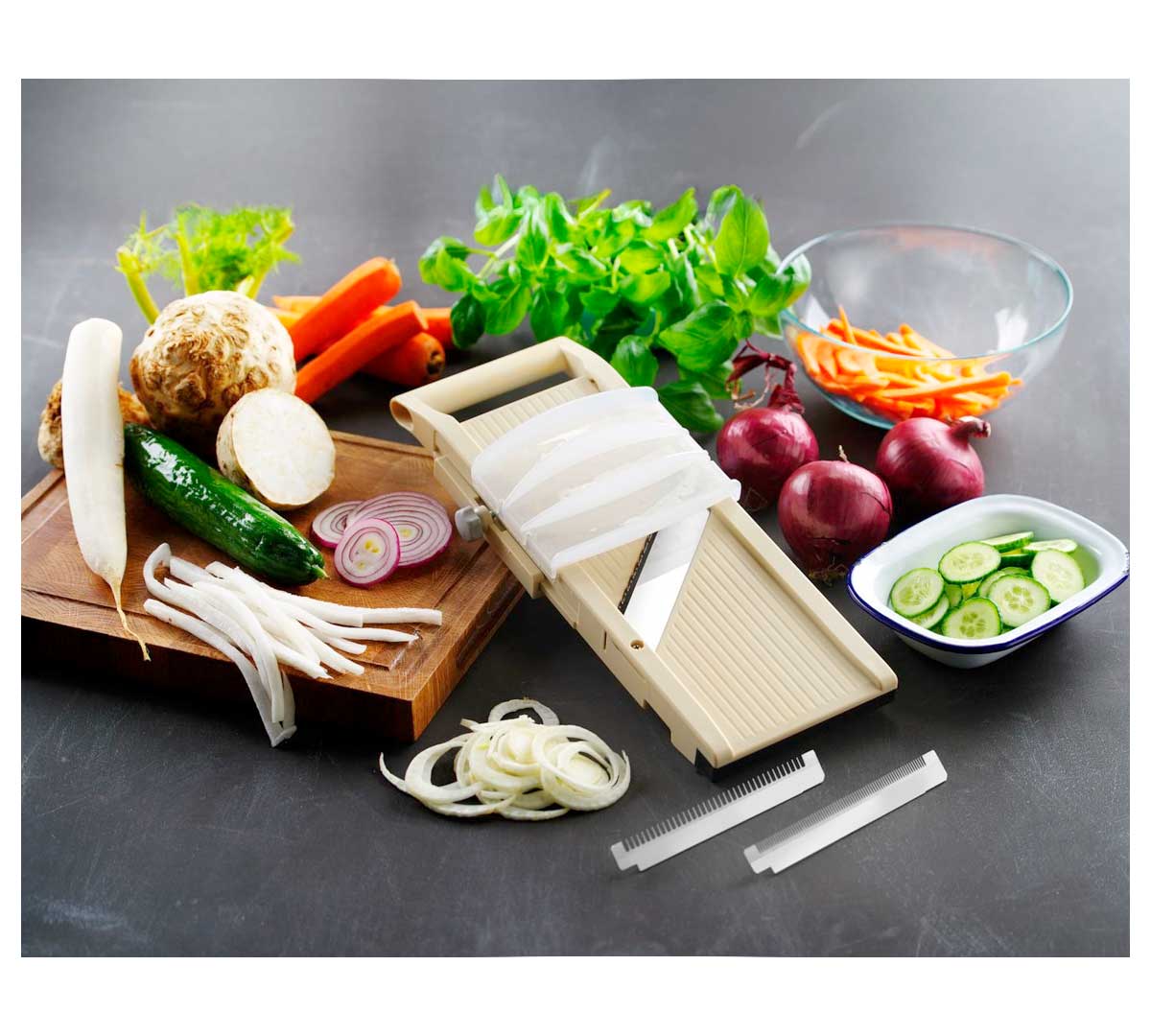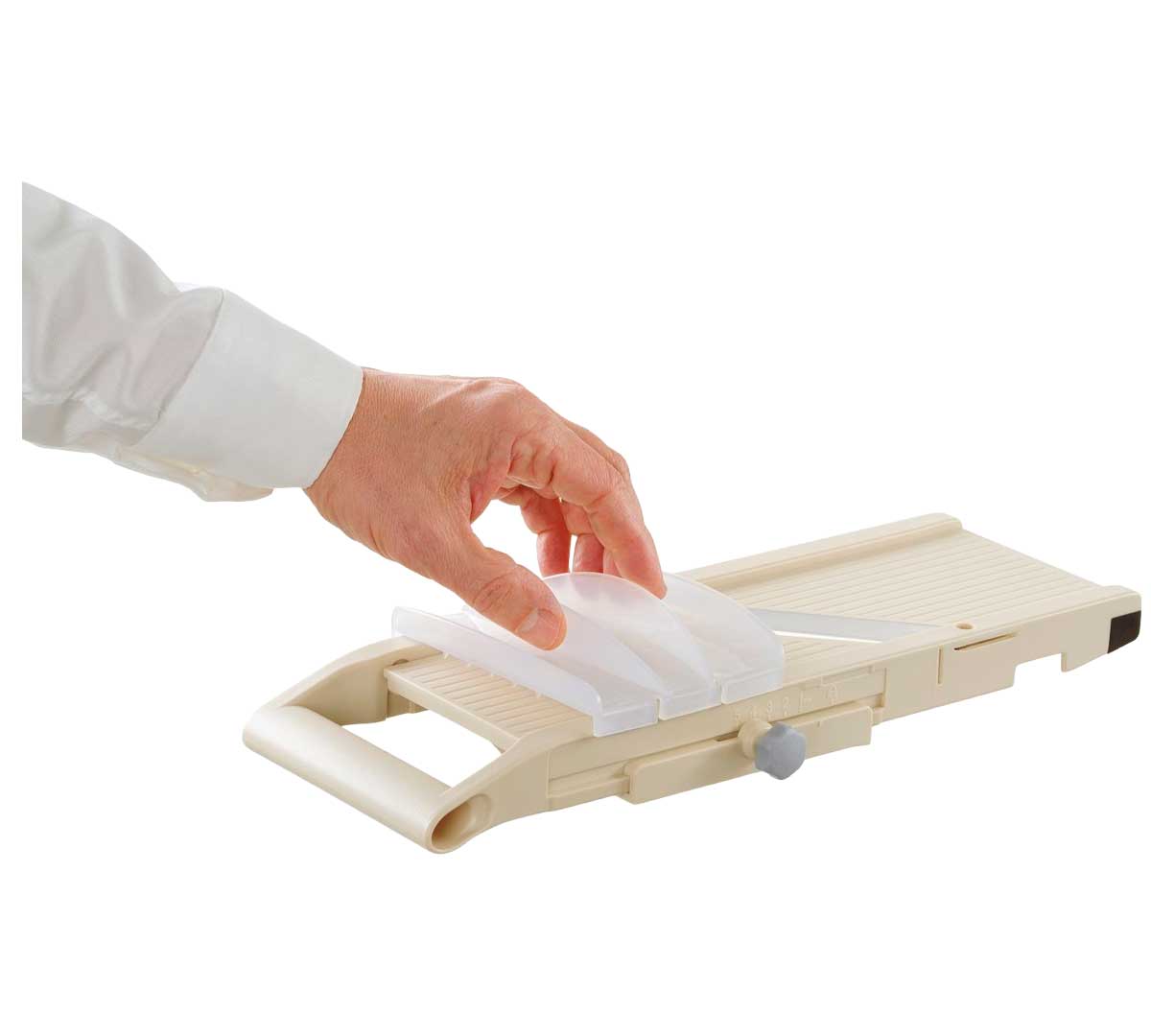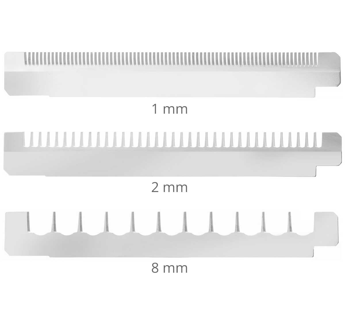 Incluye 3 hojas dentadas intercambiables para juliana de 1 mm, 2 mm y 8 mm. Además, posee una hoja plana para cortes muy finos y transparentes, permitiendo gran versatilidad en el corte.