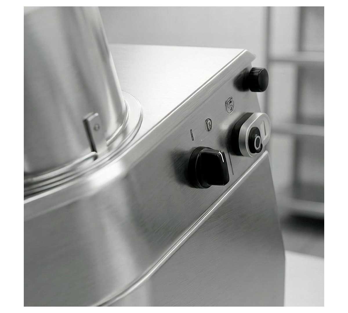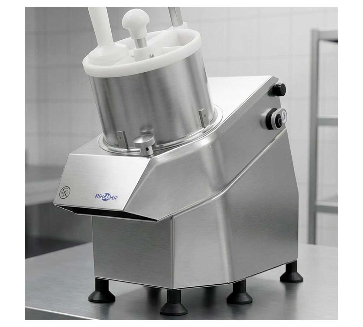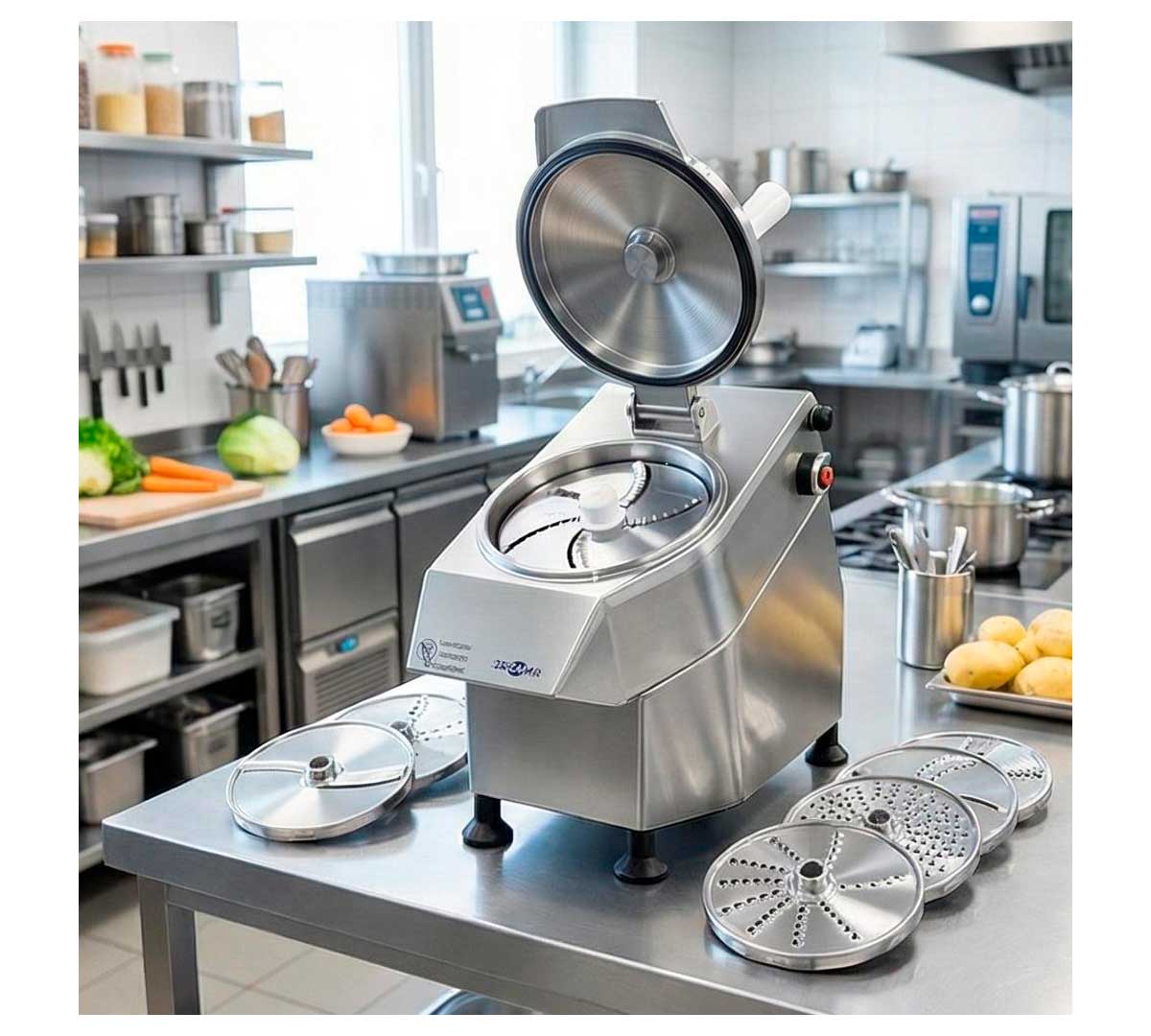 Cortadora eléctrica con cabezales intercambiables. Dispone de boca redonda de Ø 190 mm para coles, acelgas y otros alimentos enteros, además de separaciones para distintos tipos de corte. Tiene una producción de 200 a 400 kg por hora.