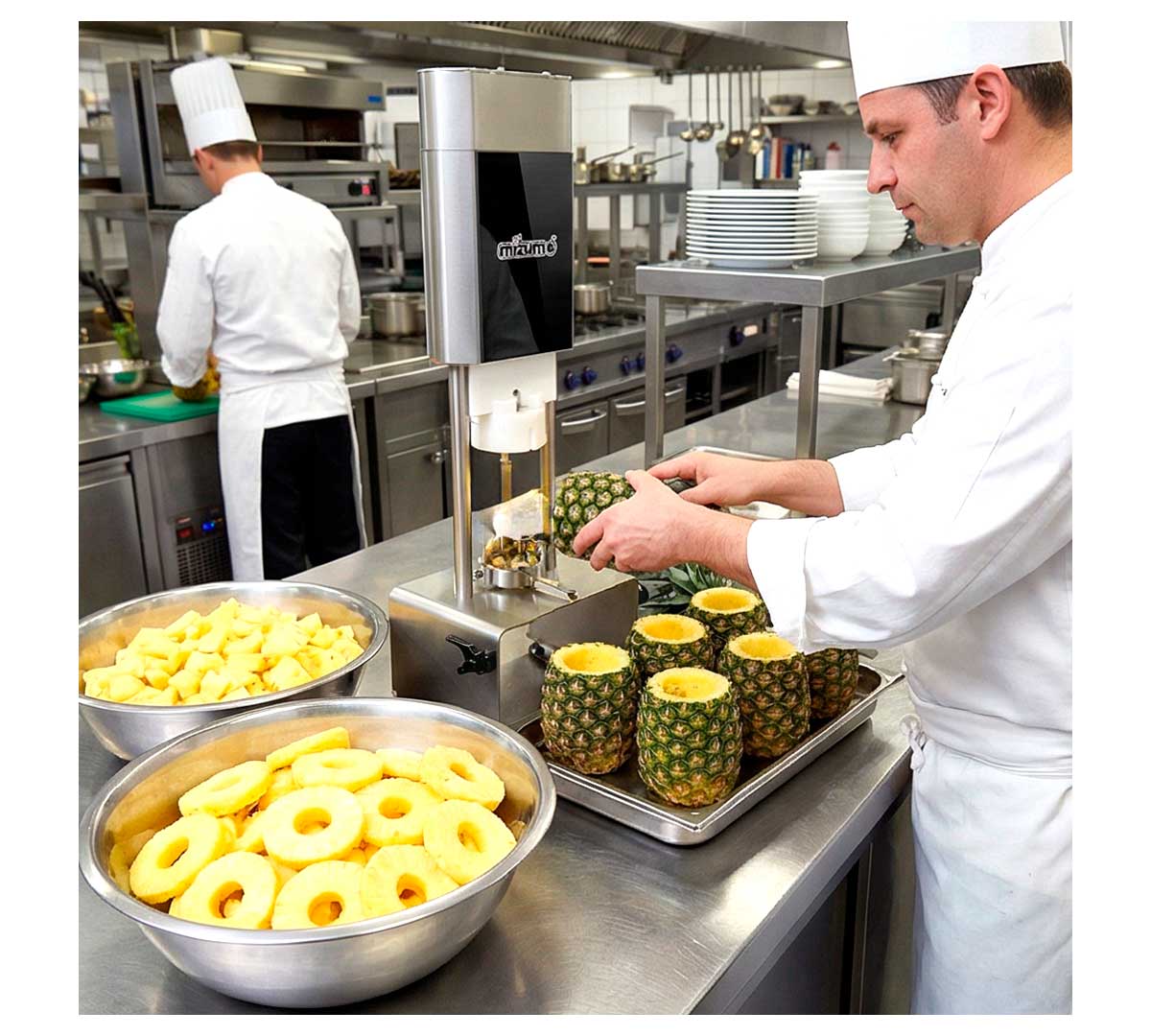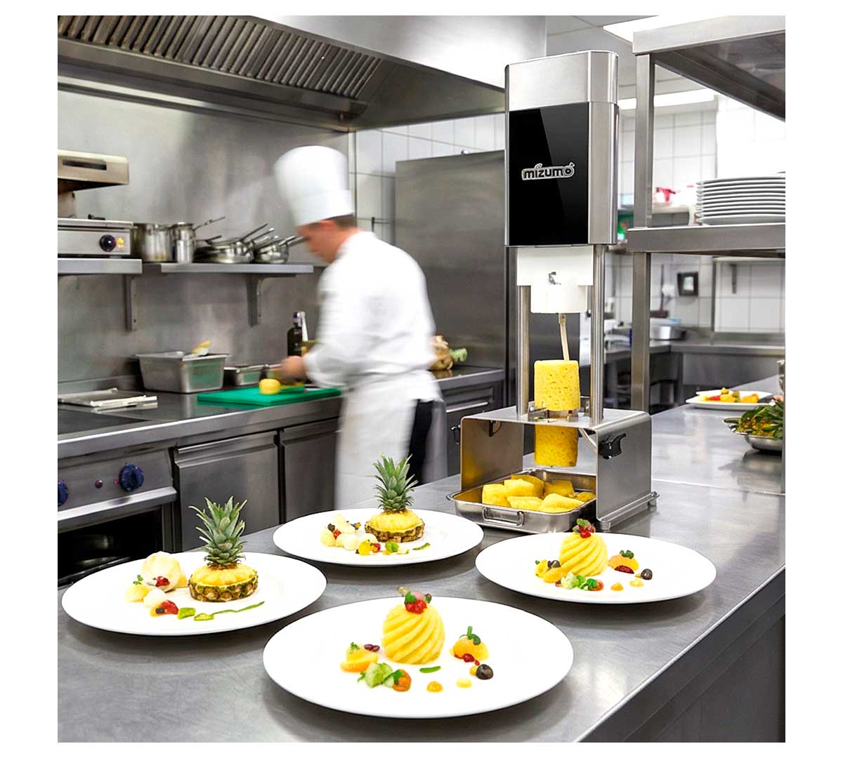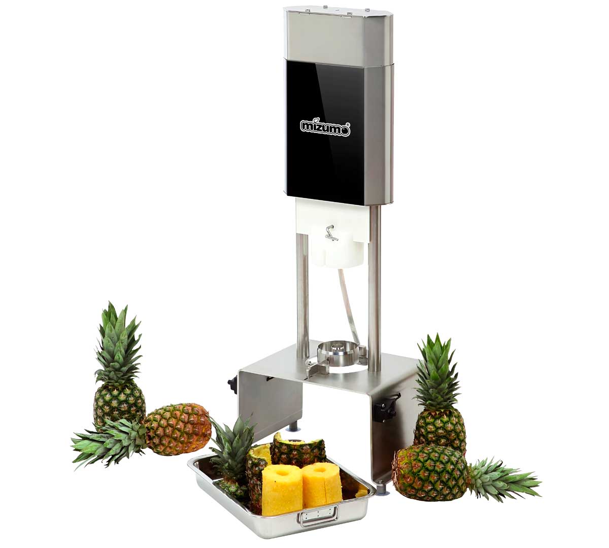 El Pelador de Piña Easy Peel Mizumo es un equipo profesional para el pelado y descorazonado automático de piñas en cocinas industriales, fruterías, buffets y negocios con alto volumen de preparación.