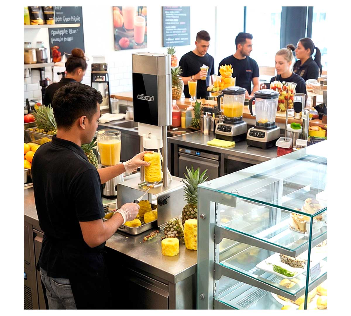 Este pelador de piñas eléctrico está orientado a puntos de venta y elaboración donde se trabaja de forma continuada con piña fresca, como barras de zumos naturales, coctelerías, bufés de desayuno, autoservicios, fruterías y espacios de preparación de fruta cortada.