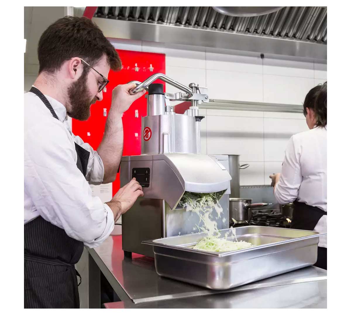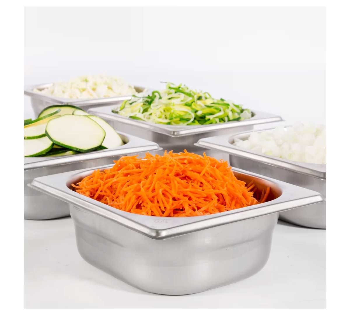 Corta Hortalizas con rendimiento profesional. Con amplia boca de entrada para introducir productos enteros. Garantiza un corte perfecto gracias a las distintas combinaciones de discos y rejillas que se adaptan a cada necesidad. Permite corte de cubos precisos y limpios, sin generar líquidos. Con bloque Motor de 1 Velocidad + Cabezal gran capacidad.