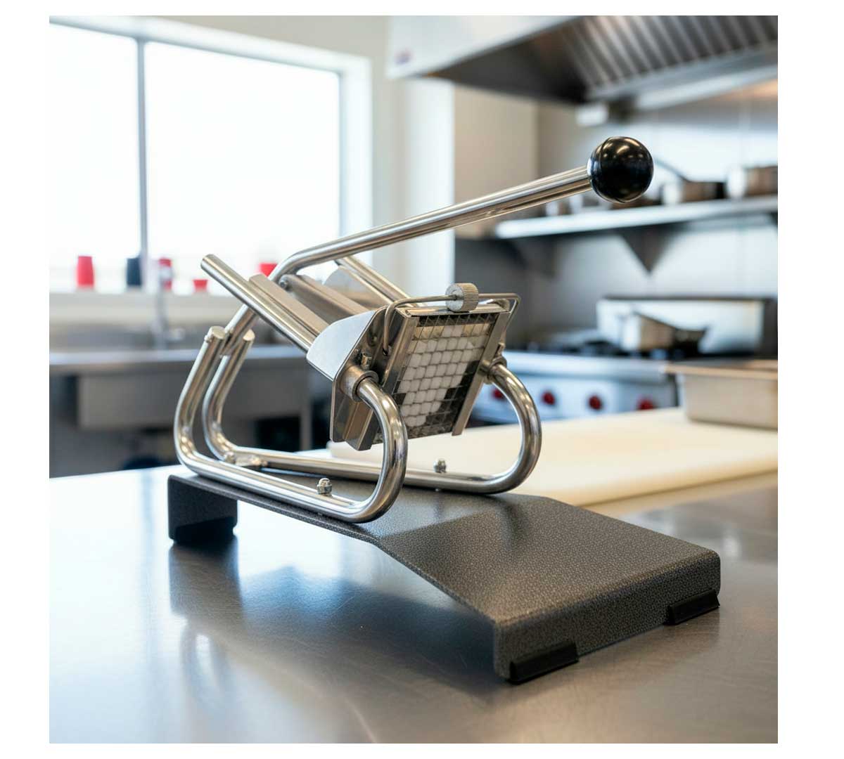 Cortador de patatas que permite cortar hasta 5 kg de patatas al minuto, un ritmo ideal para negocios de comidas donde se atiende a un gran número de comensales. Fabricado en acero inoxidable. Se le pueden intercambiar 7 tipos de cuchillas.