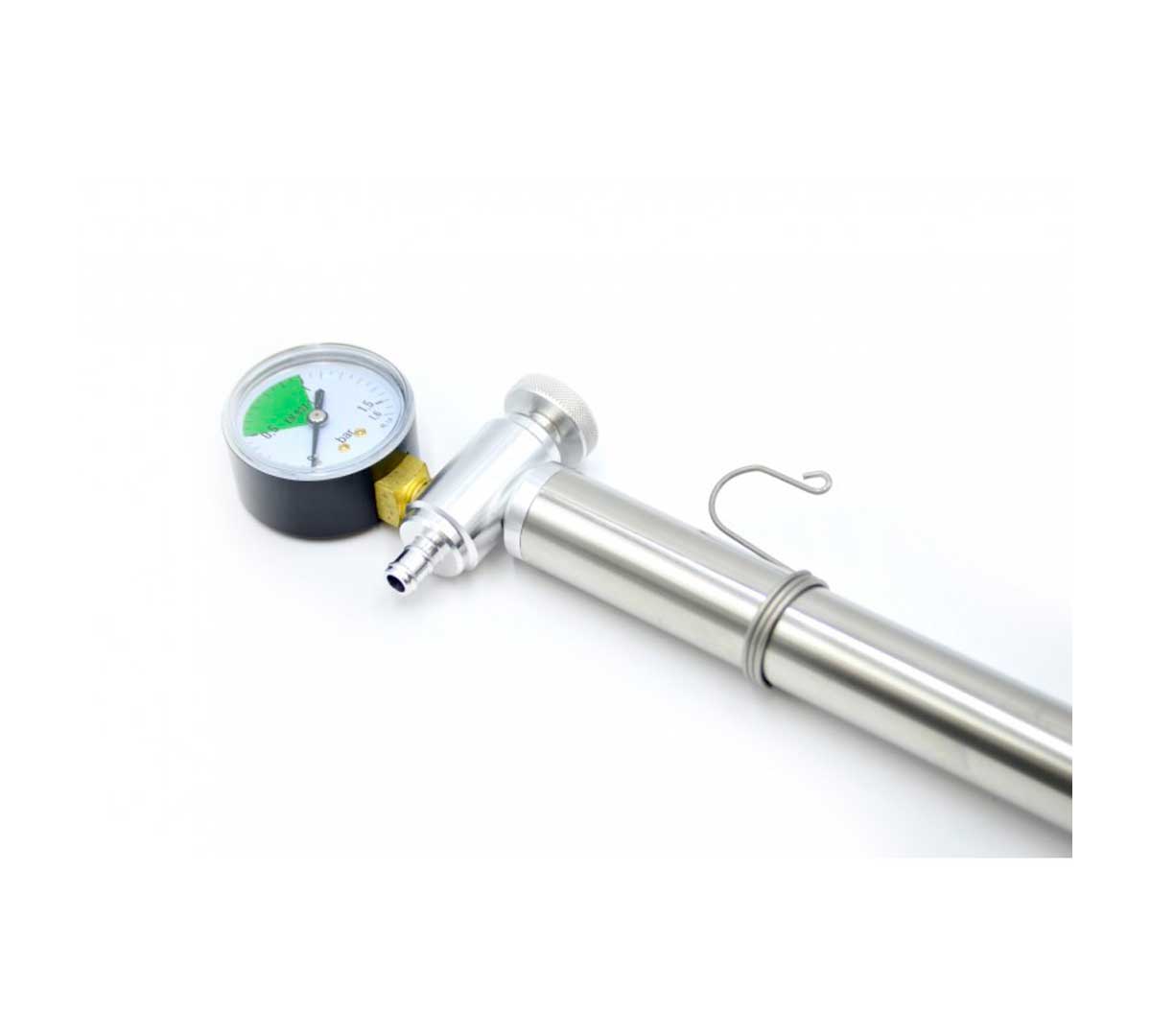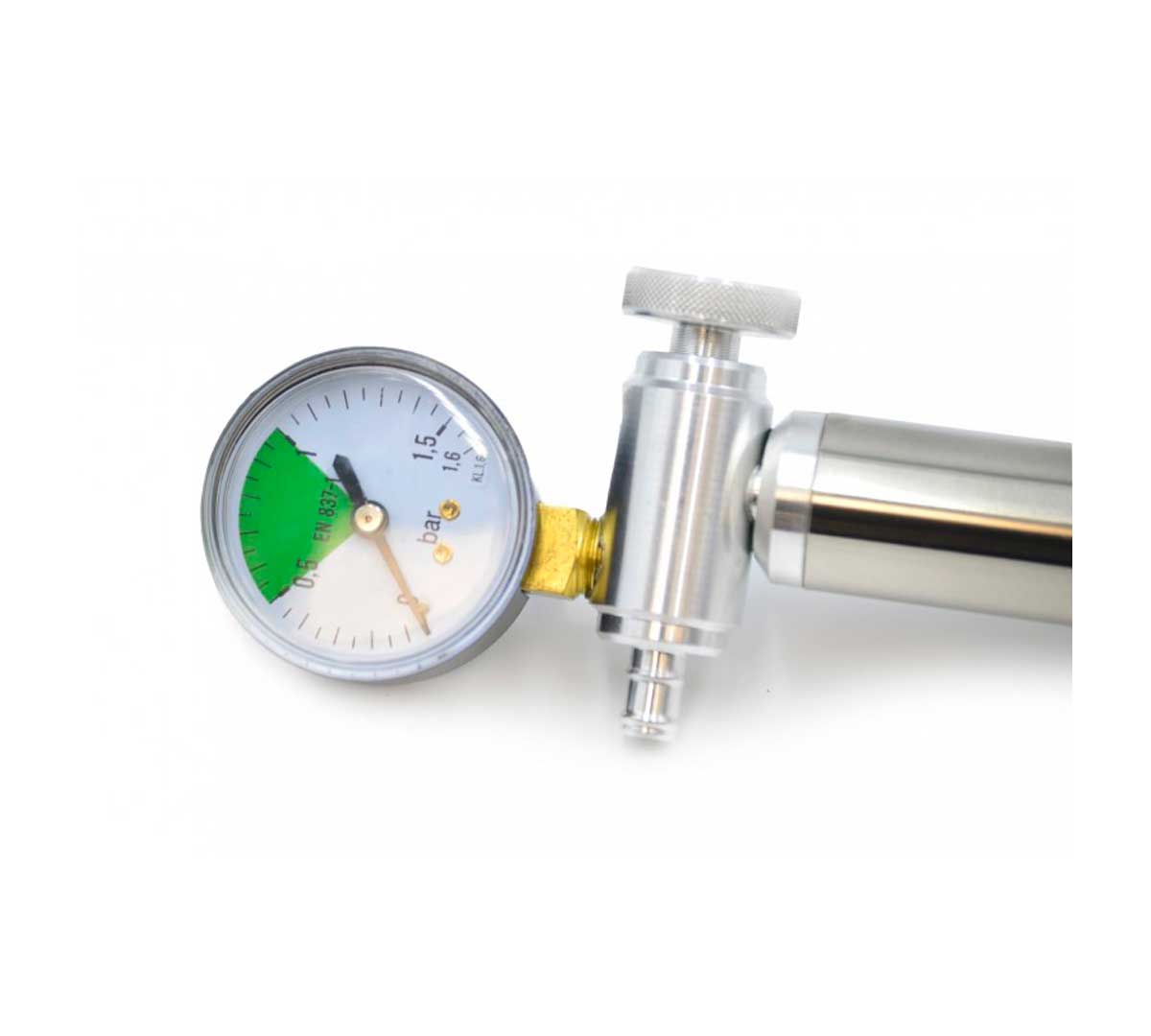 Bombín para inflado de cámara en depósitos siempre llenos. Tiene un diámetro de 2,8 cm. Pesa 0,440 kg. El bombín mediante el manómetro indica la presión que ejerce la cámara sobre el depósito. Lo mantiene en el punto correcto y evita que entre aire en el interior.