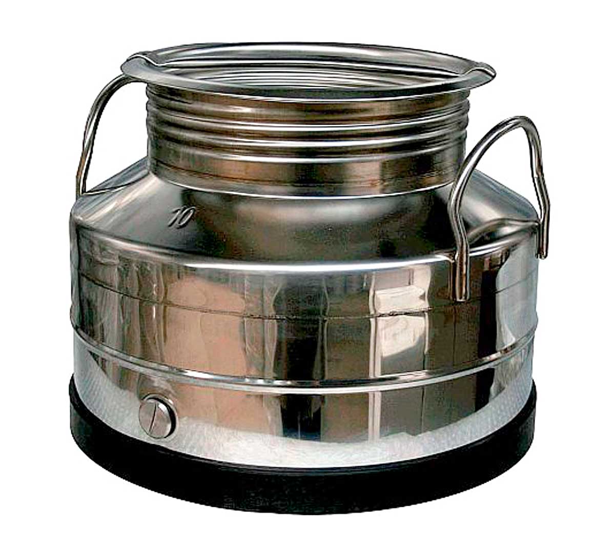 Depósito en acero inoxidable AISI 304 para transporte y almacenamiento de líquidos alimentarios, con tapa de rosca, asas y racor soldado para grifo, no incluye grifo.