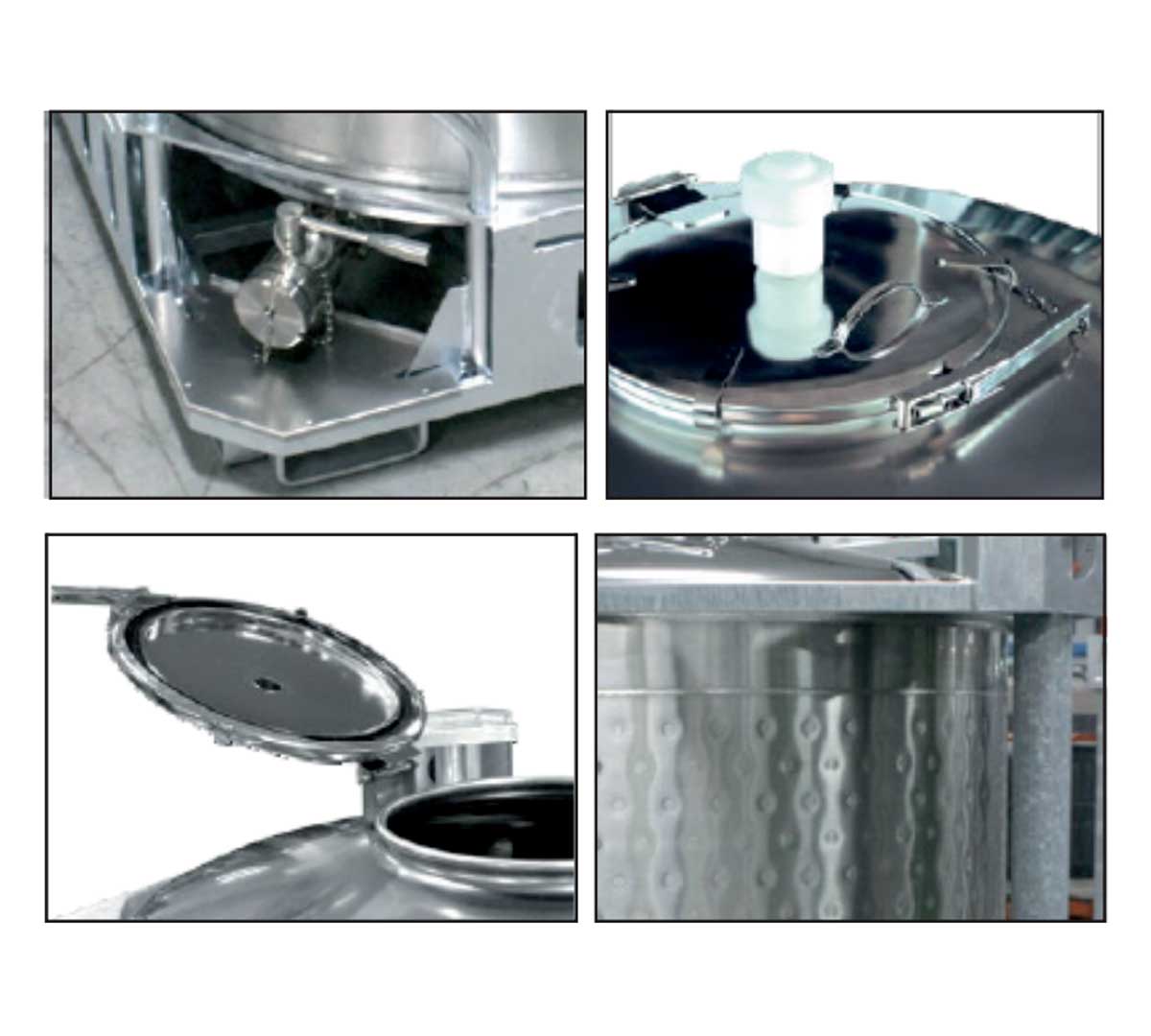 Depósito cilíndrico alimentario para almacenamiento. Está fabricado en acero inoxidable. Permite apilar hasta dos depósitos llenos. Dispone de fondo moldeado en frío y acabado externo satinado. Incorpora una base tipo pallet con guía para carretilla elevadora y trans-palet manual. Está disponible en cinco tamaños.
