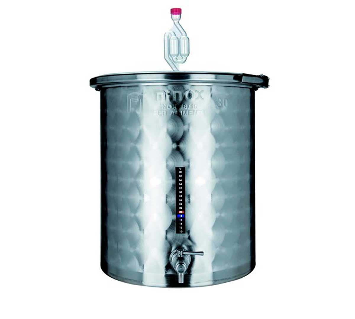 Fermentador inoxidable de fondo plano con capacidades de 35, 55 y 110 litros, fabricado en acero AISI 304 con válvula inferior y sistema airlock. Solución compacta para fermentación controlada en producciones artesanales y uso profesional.