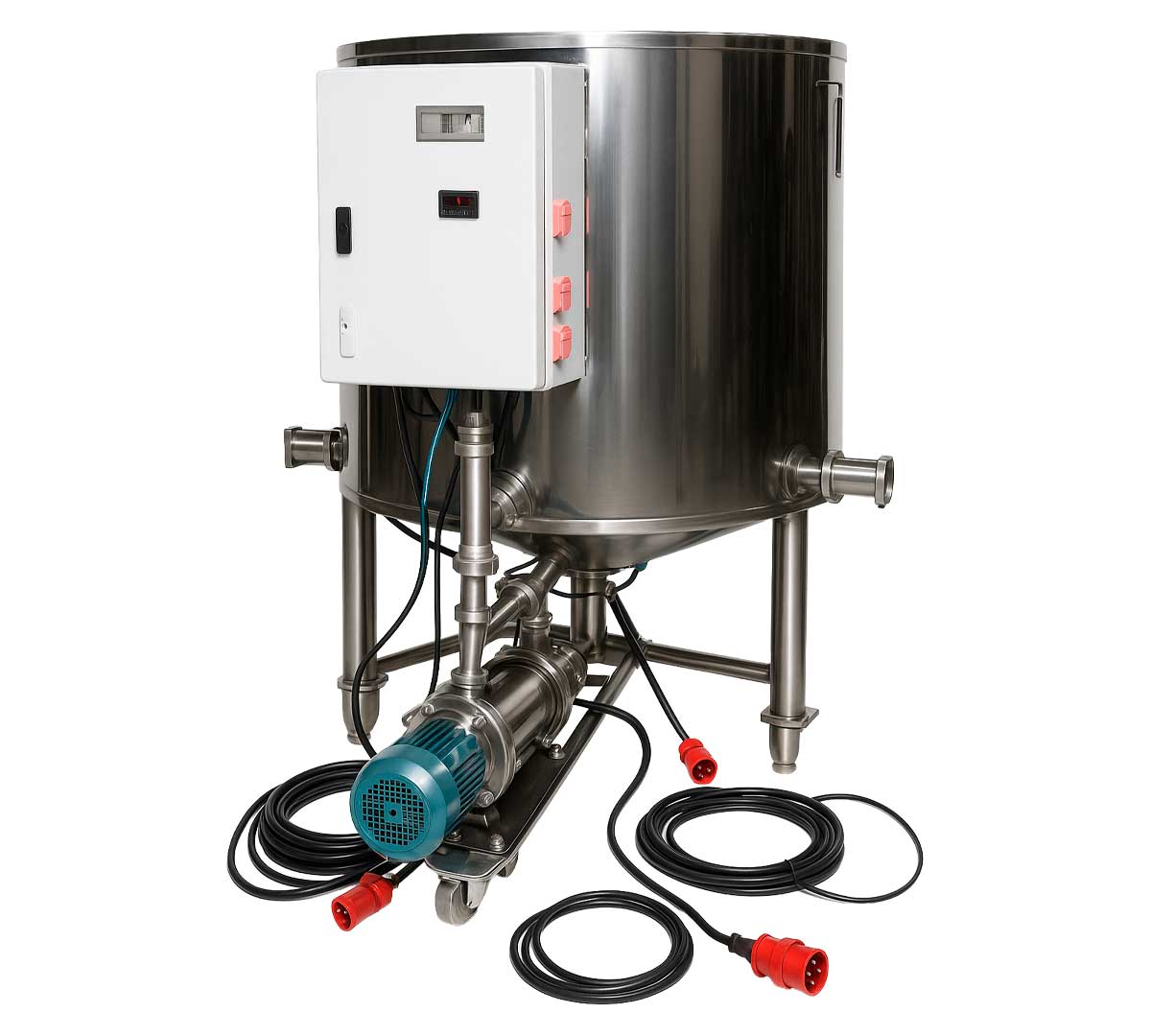 Resulta muy útil como depósito intermedio de proceso, para alimentación de otras máquinas mediante la bomba integrada o como tanque de preparación previa antes de envasado u operaciones posteriores.