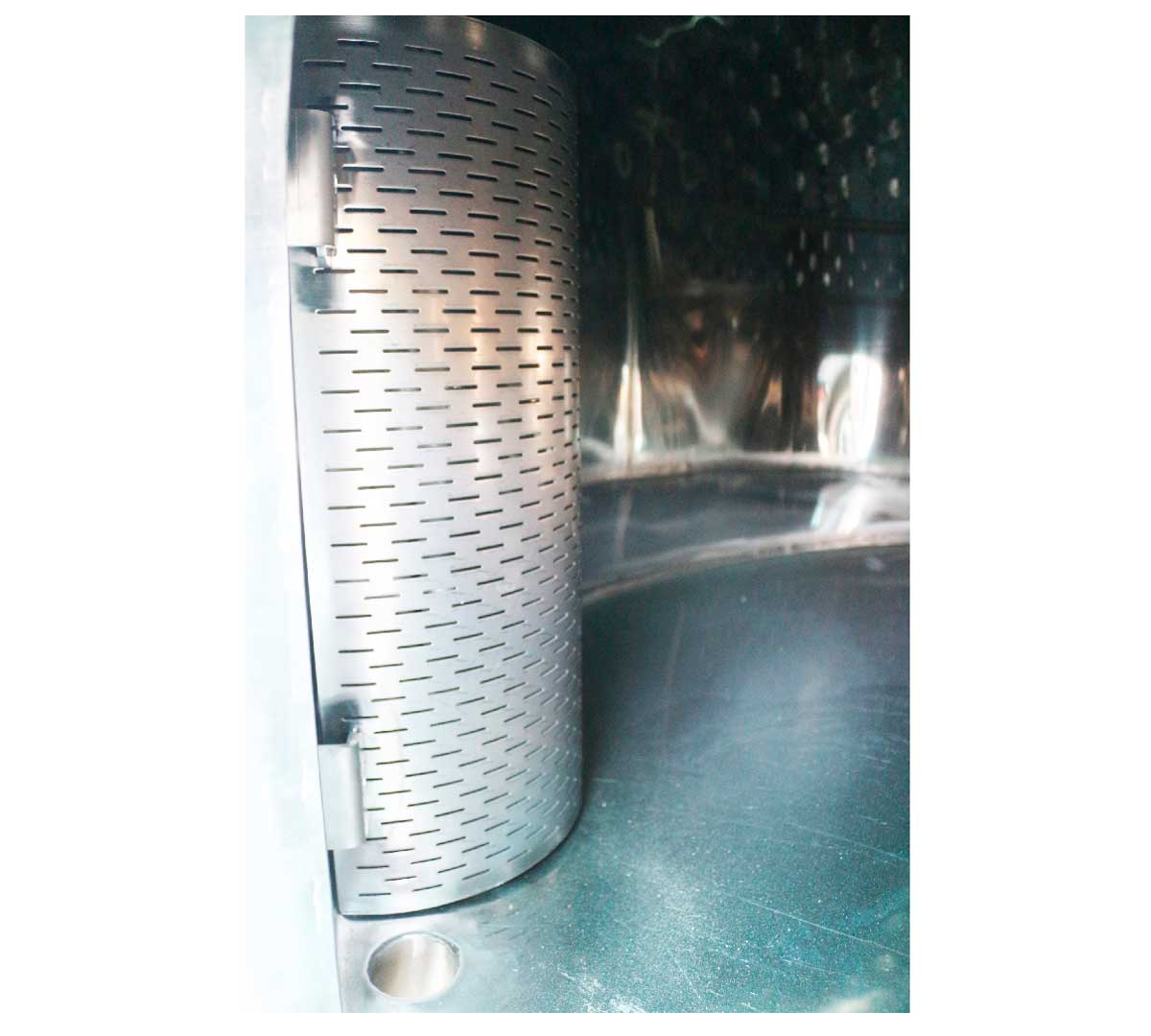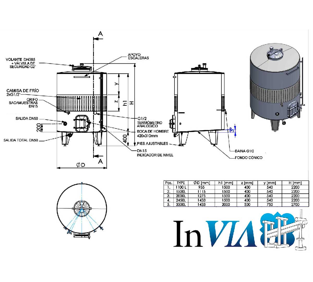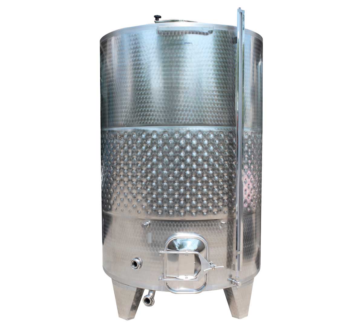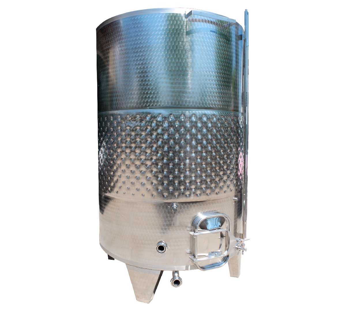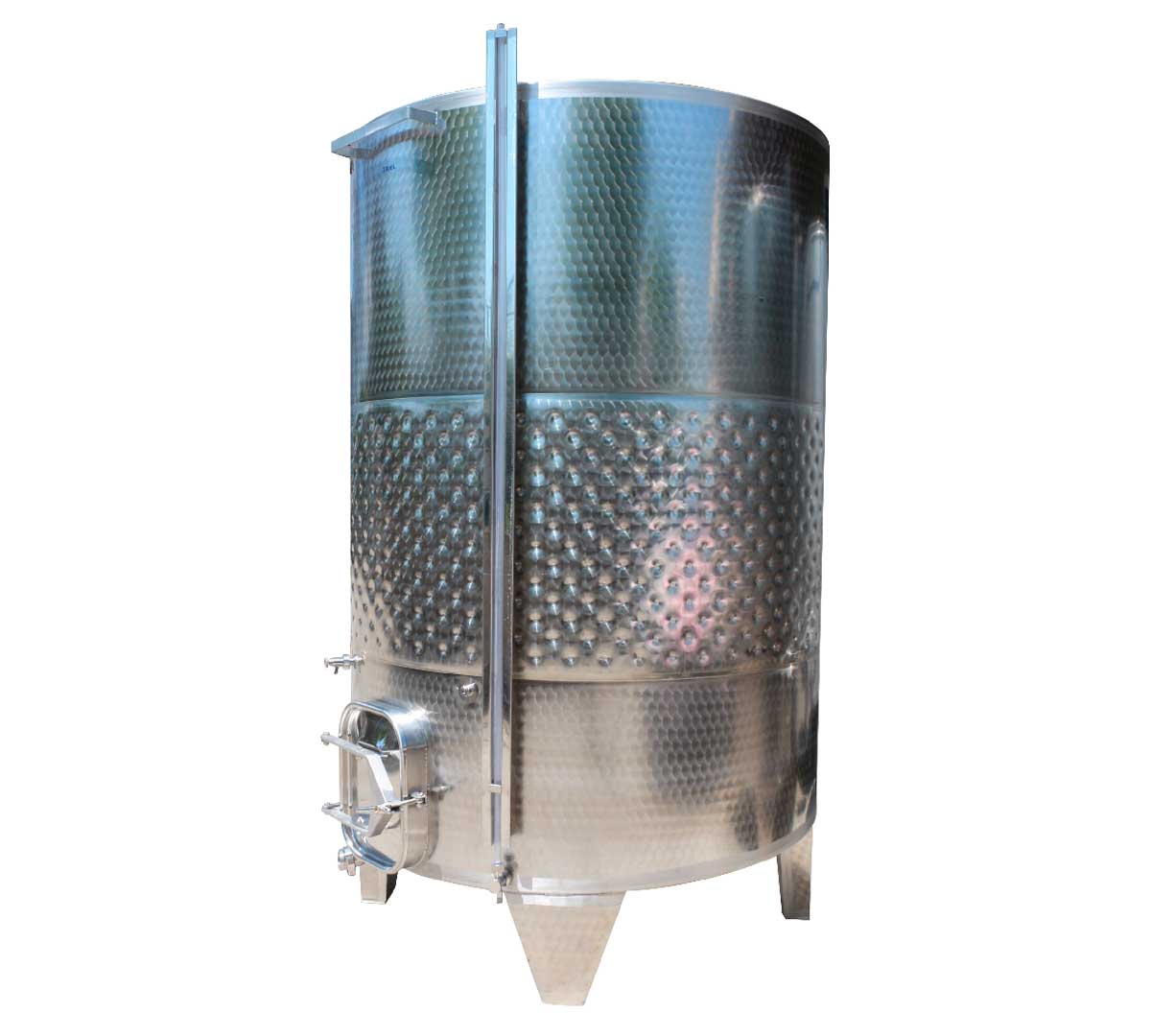 Depósito con cúpula cónica y boca de acceso. Dispone de volante y sistema de apertura con brazo y perno giratorio. Está fabricado en chapa inox con acabado interior pulido y exterior adamascado. El fondo es plano inclinado indicado para vinificación con hollejos o pieles y almacenamiento.