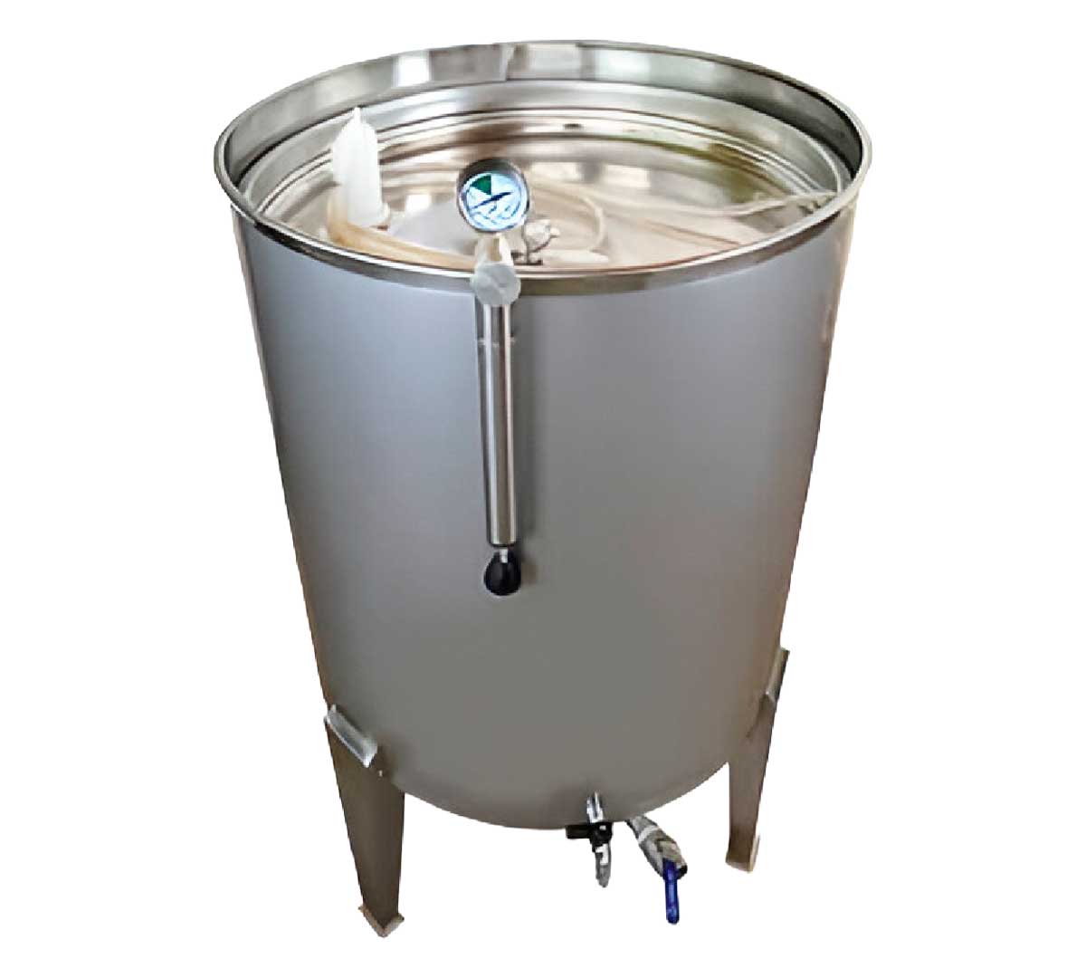 Depósito sin boca con fondo cónico para facilitar el vaciaod. Está fabricado con cuerpo y patas en acero inoxidable. Se utiliza para almacenamiento y fermentación de vinos y cervezas. Incluye dos válvulas cromadas inferiores y tapa siempre lleno completa.