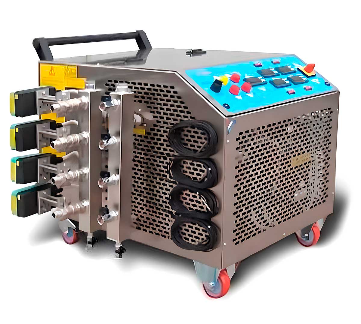Equipo de frío con cuatro unidades de control. Envía el frío de forma independiente a cada depósito. Se conecta cada camisa de frío con el equipo mediante mangueras. Es adecuado para depósitos de fermentación de hasta 9.800 litros. Está disponible con resistencia o sin resistencia.
