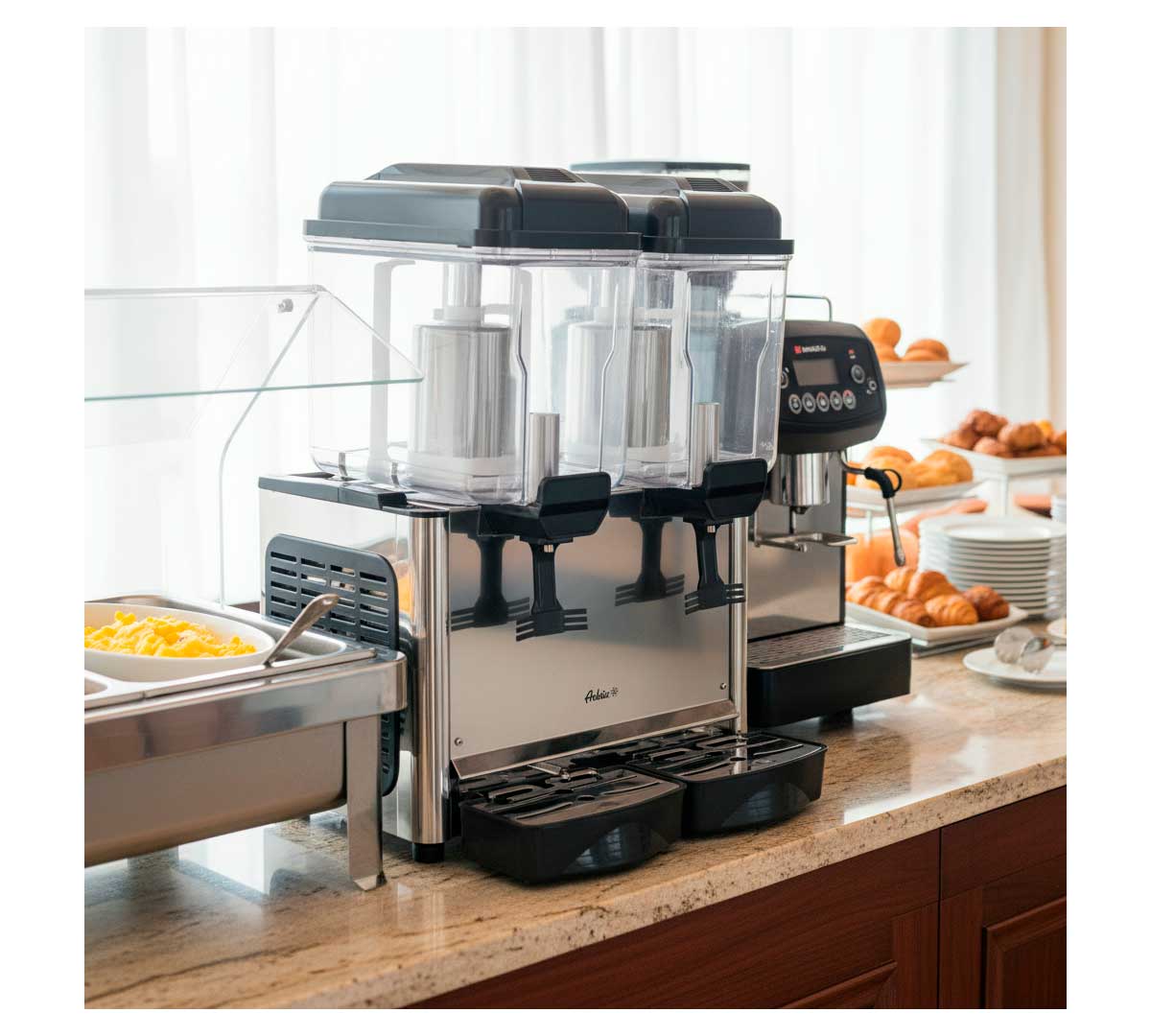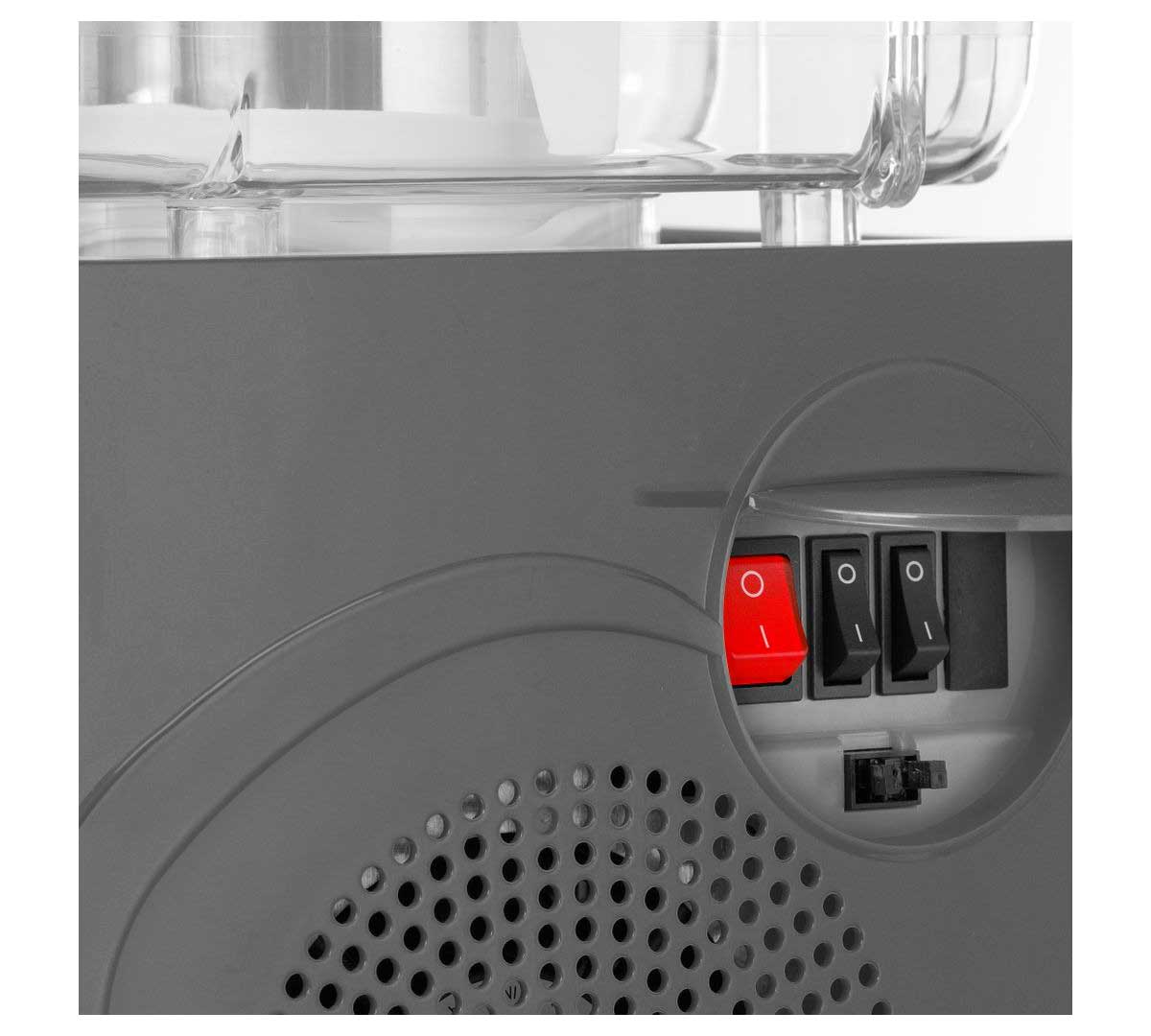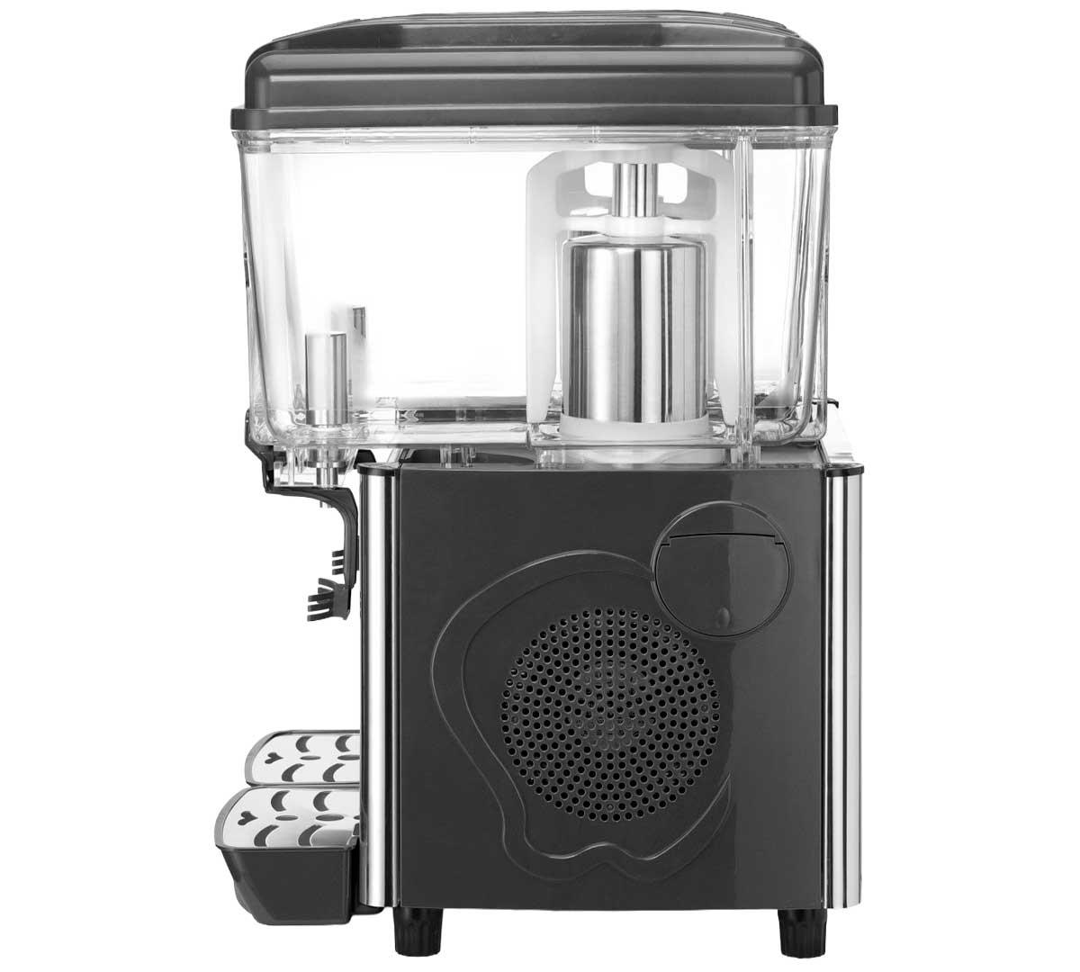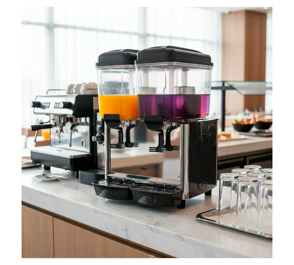 Este dispensador, también conocido como máquina dispensadora de bebidas frías, destaca por su capacidad de 24 litros distribuidos en dos depósitos independientes, lo que permite ofrecer variedad y mantener grandes volúmenes siempre listos para el autoservicio.