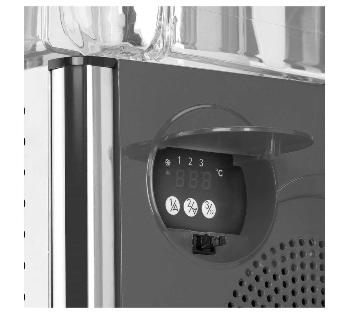 Dispensador para zumos doble. Tiene control de temperatura que puede configurarse entre 0 y 10 ºC. Los depósitos pueden extraerse para una fácil limpieza. Incluye bandeja de goteo.