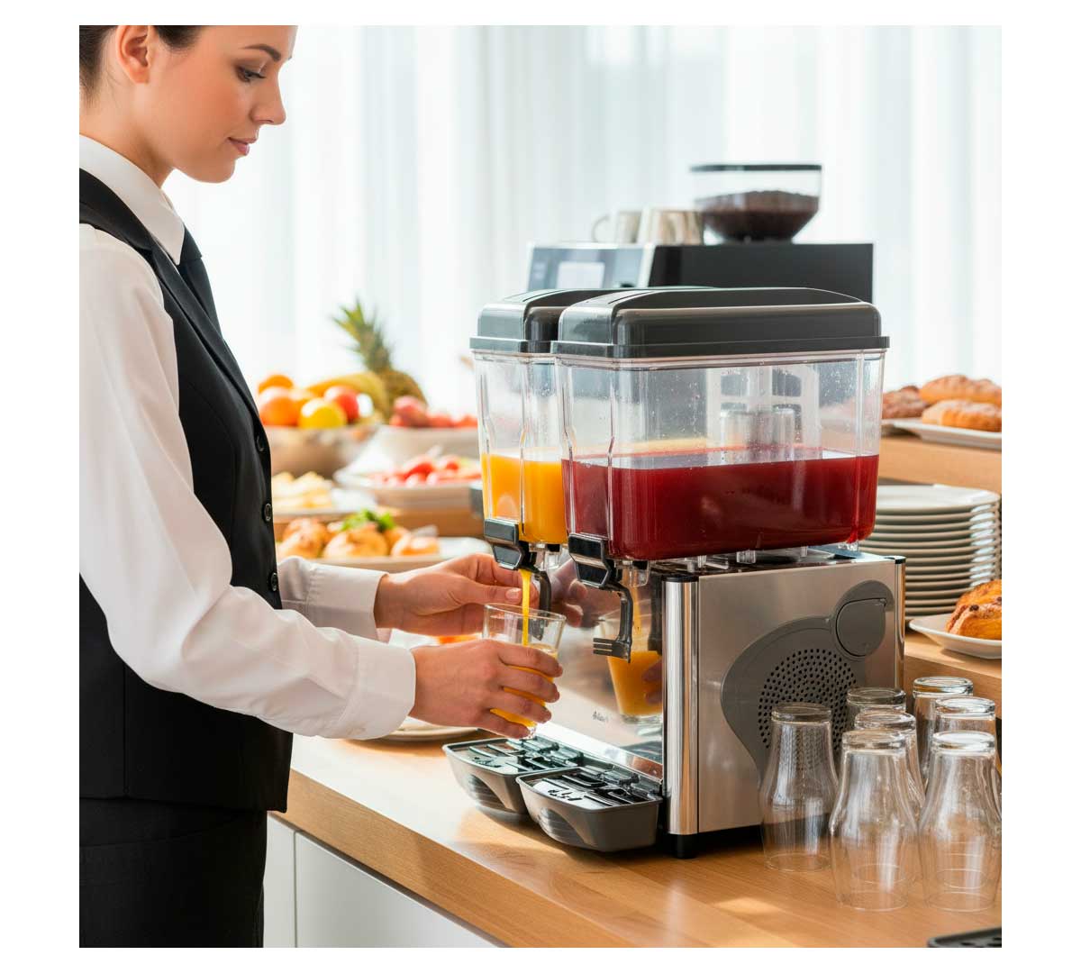 Este dispensador de zumos es perfecto para el autoservicio en bufés, cafeterías, comedores de empresa, panaderías y cualquier establecimiento que requiera servir bebidas frías de forma continua y segura. Su diseño facilita el acceso tanto para el personal como para los clientes, manteniendo la bebida siempre a la temperatura deseada y en condiciones higiénicas óptimas.
