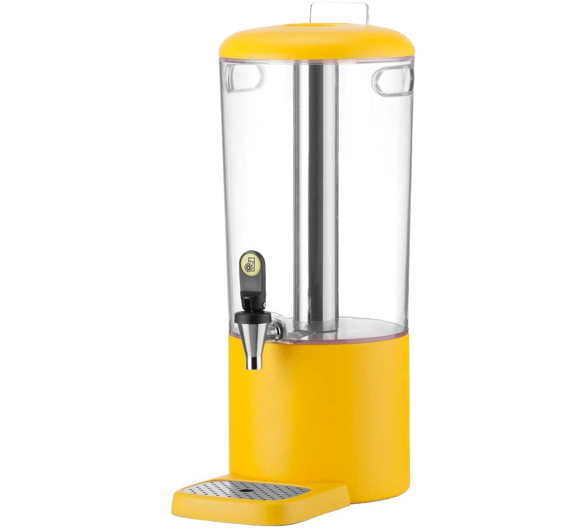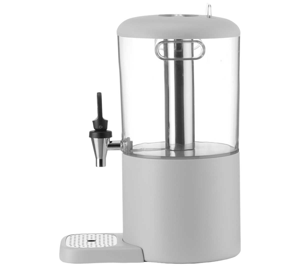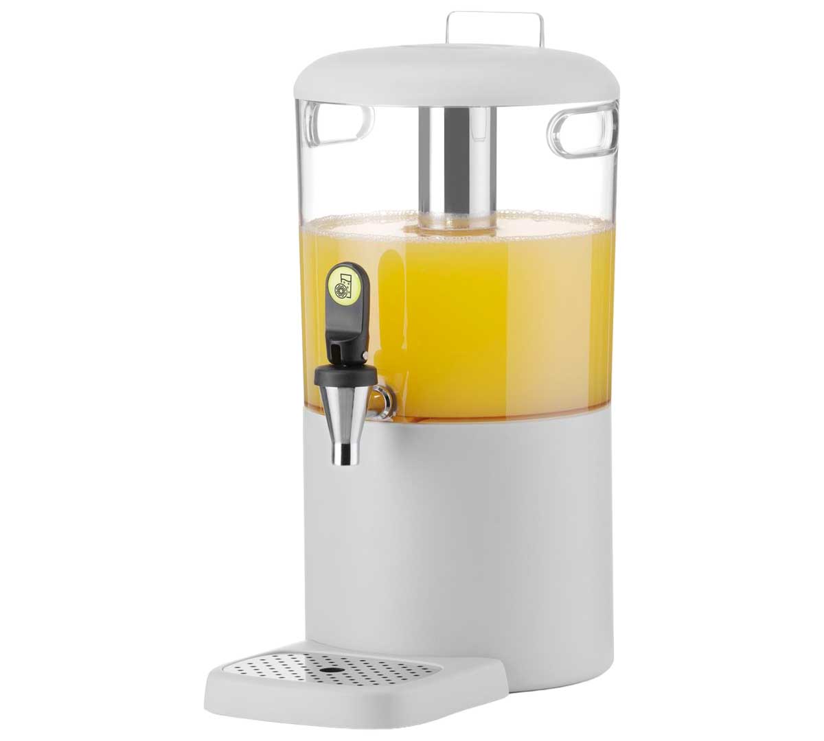 Dispensador de zumos diseñado para buffets. Está equipado con un tubo extraíble para hielo que permite mantener la bebida fría. Tiene un grifo antigoteo situado a 13 cm sobre la base y una bandeja desmontable. Con soporte para etiquetas para identificar las bebidas servidas.