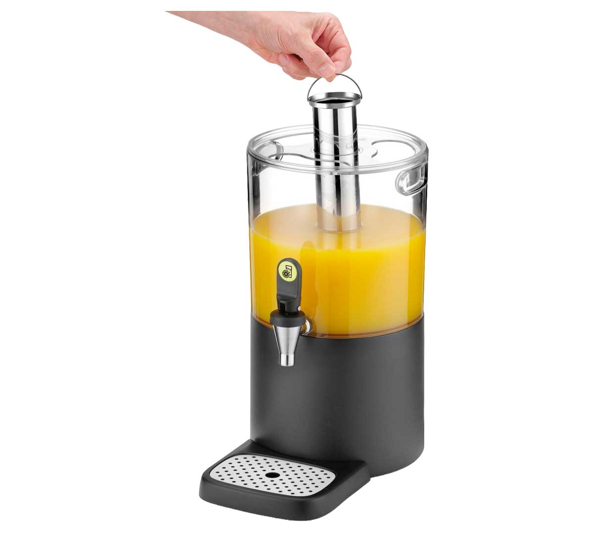 El tubo de enfriamiento extraíble de acero inoxidable permite añadir hielo directamente sin diluir la bebida, manteniendo el zumo frío durante más tiempo en buffets y catering.