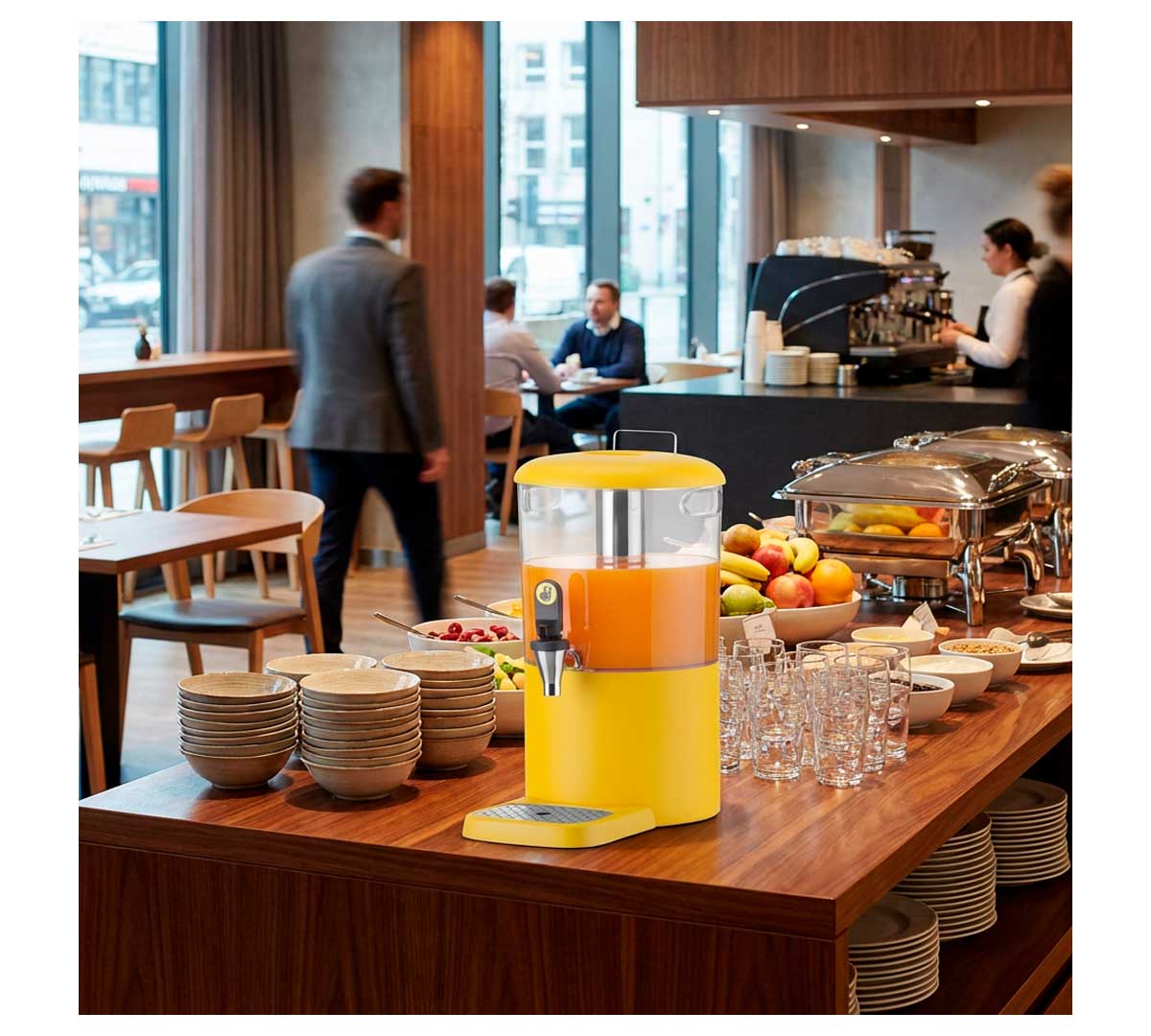 Este dispensador está especialmente indicado para la presentación y servicio de zumos, aguas aromatizadas y otras bebidas frías en buffets de hoteles, desayunos, brunches, eventos y celebraciones. Su diseño facilita el autoservicio y garantiza una experiencia cómoda y visualmente atractiva para los comensales.