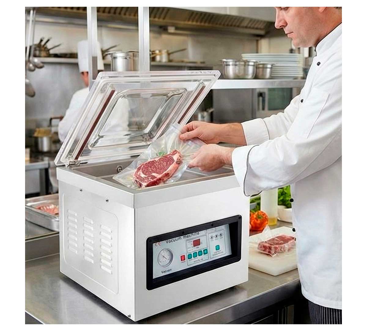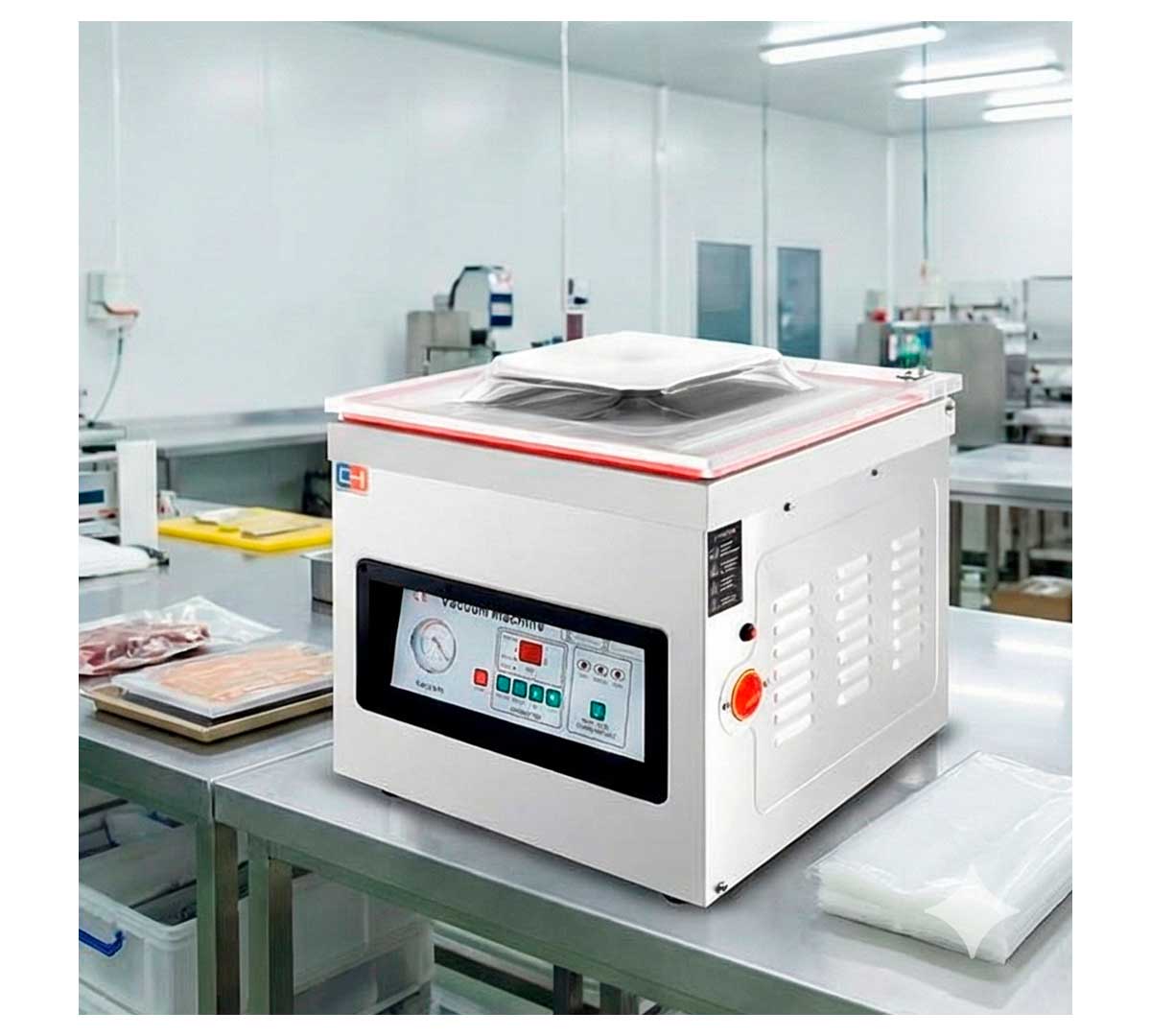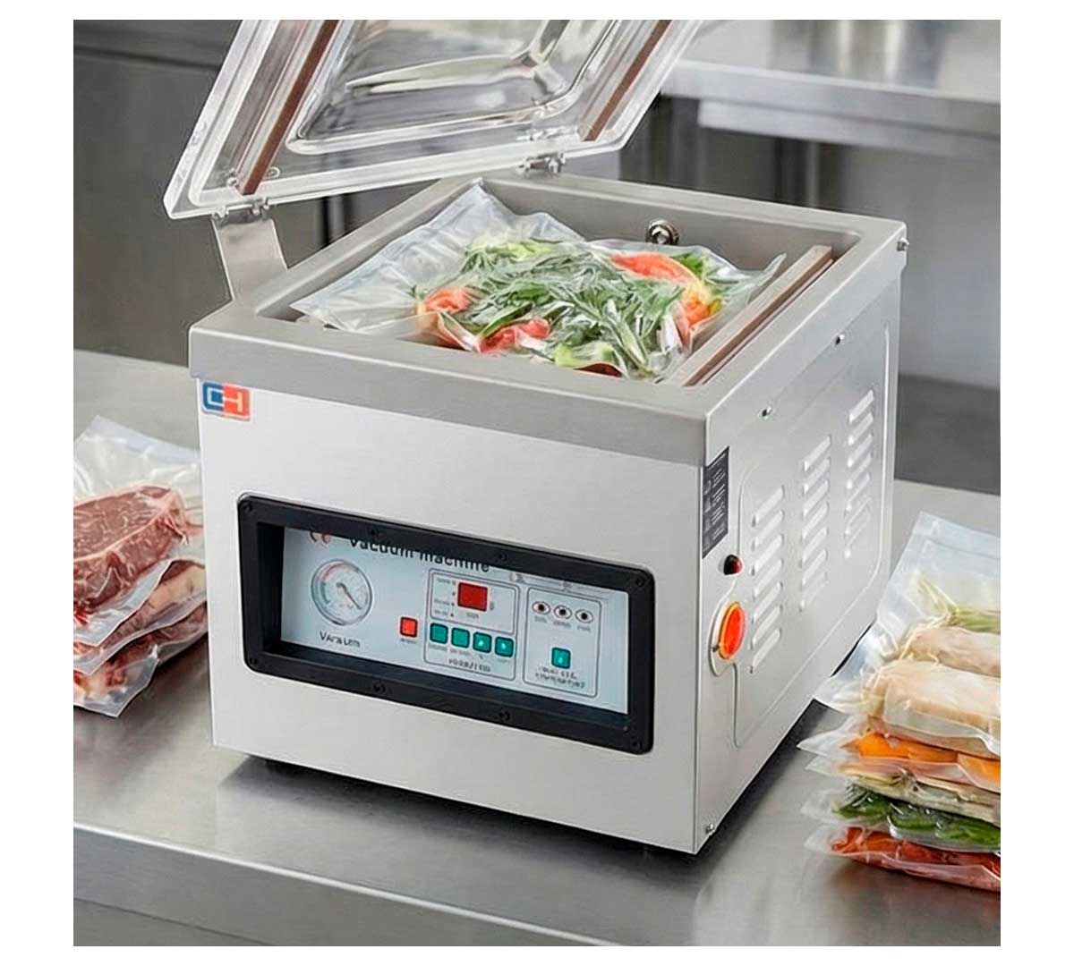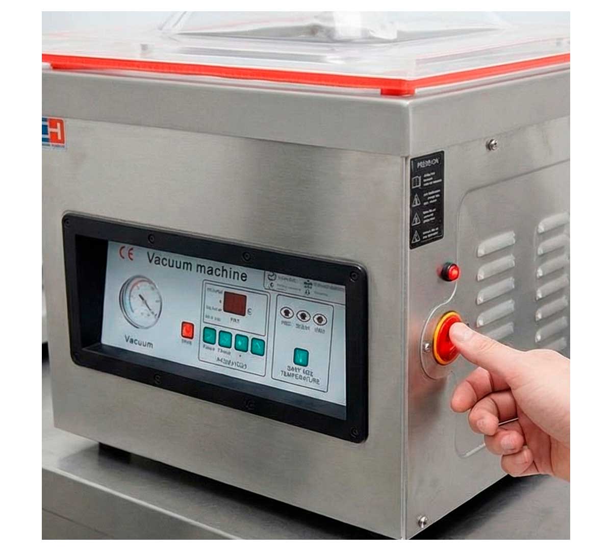 Envasadora al vacío de doble barra de soldadura. Con cúpula de metacrilato transparente y totalmente desmontable para su fácil limpieza. Provista de pantalla digital y vacuómetro.