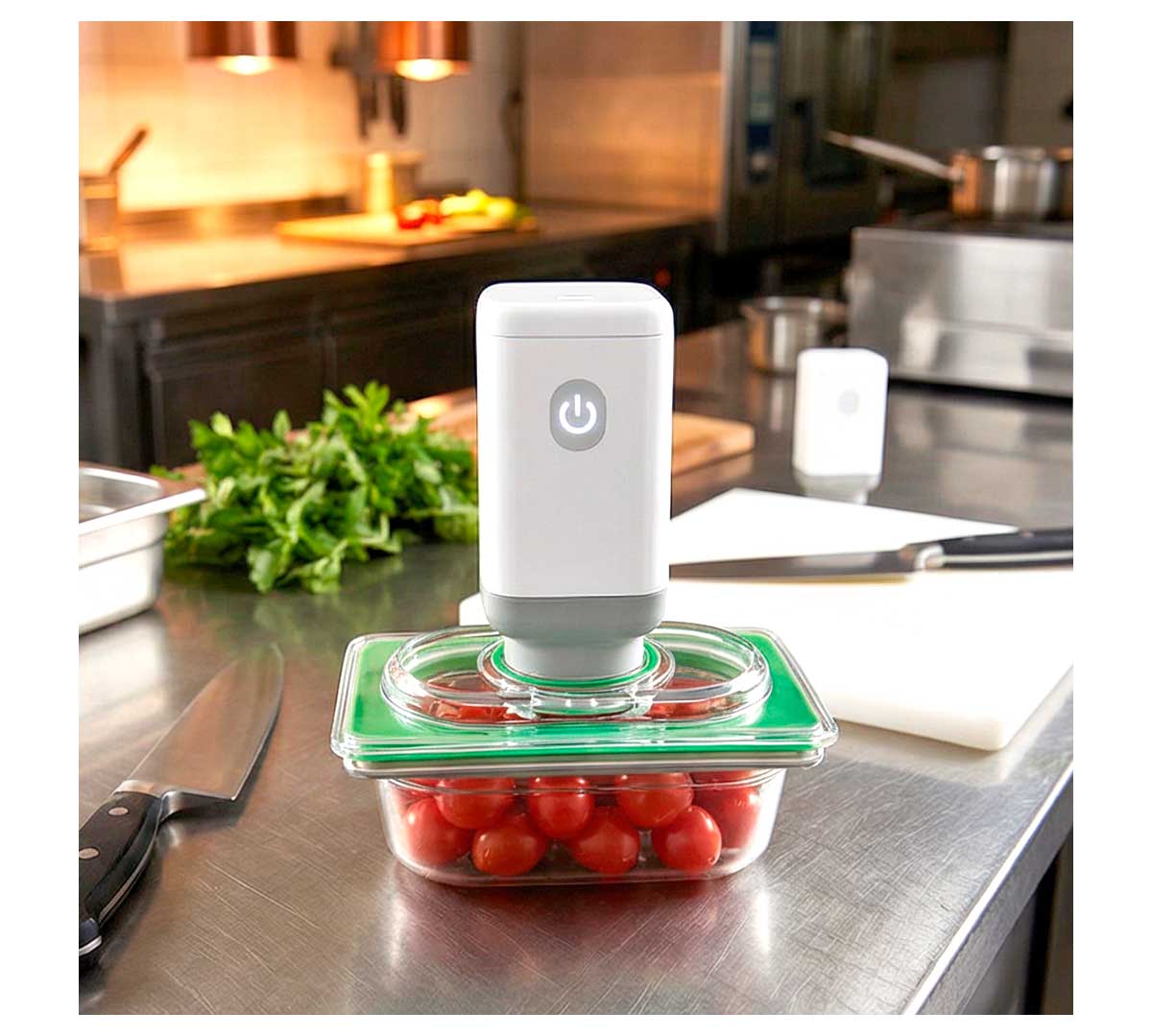 Máquina de vacío portátil para cubetas gastronorm, ligera y sin cables. Con batería recargable por USB. Permite extraer el aire de cubetas de distintos tamaños de forma rápida y eficiente.