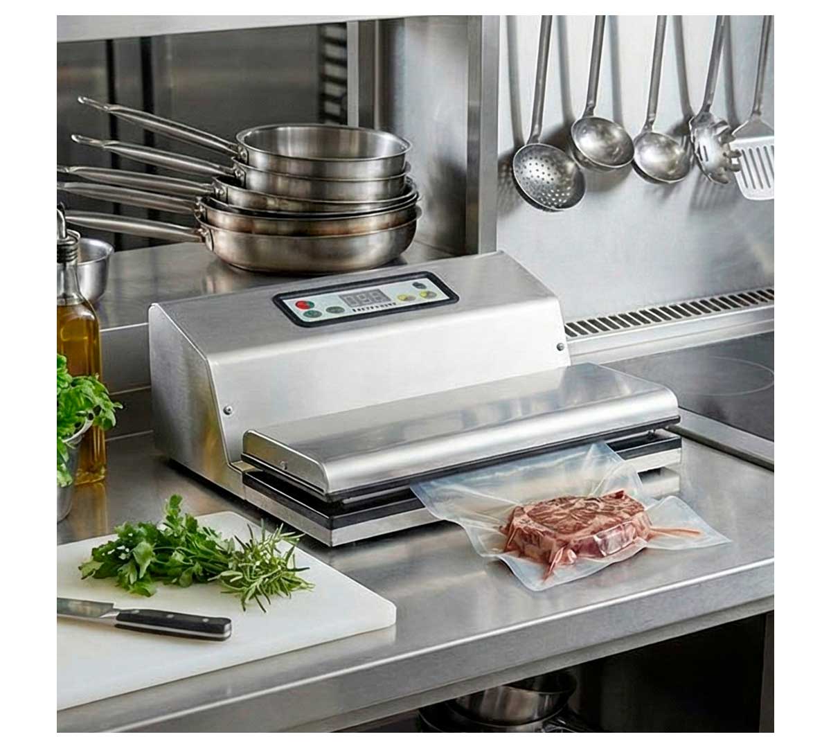Envasadora exterior al vacío Fast Vacuum de Orved, con vacío y soldadura automático y/o manual electrónico. Recomendada para comercios y bares.