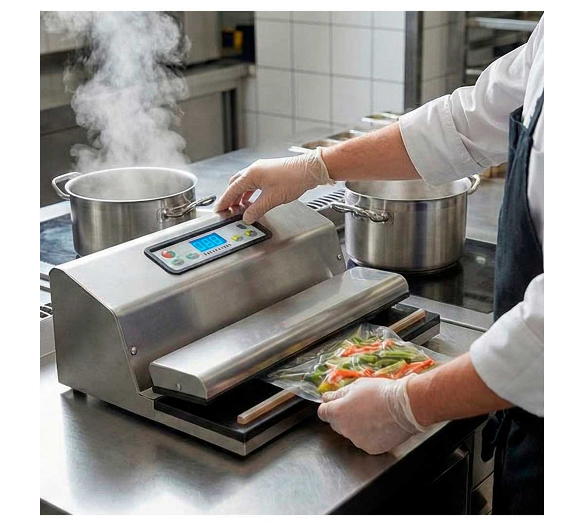Envasadora al vacío externa, rápida y automática. Indicada para entornos profesionales o domésticos. Incorpora mandos digitales y bomba autolubricante. Está provista de accesorios que permiten conservar productos sólidos y líquidos en recipientes con válvula. Indicado únicamente para su uso con bolsas gofradas.