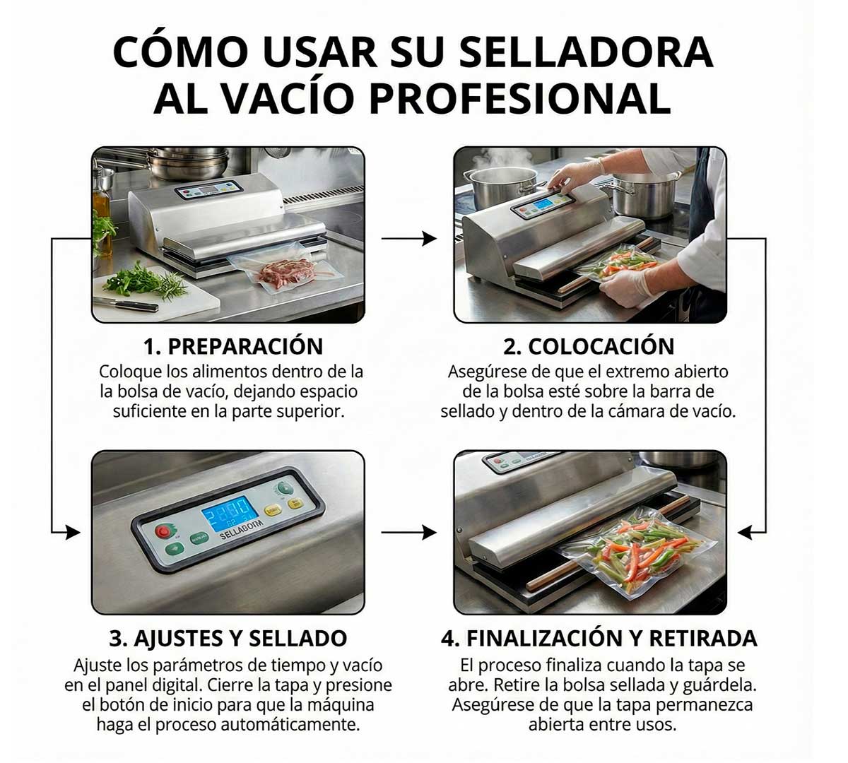 Garantiza un vacío profesional y su panel de mandos de pantalla led permite visualizar con precisión el nivel de vacío y soldadura.