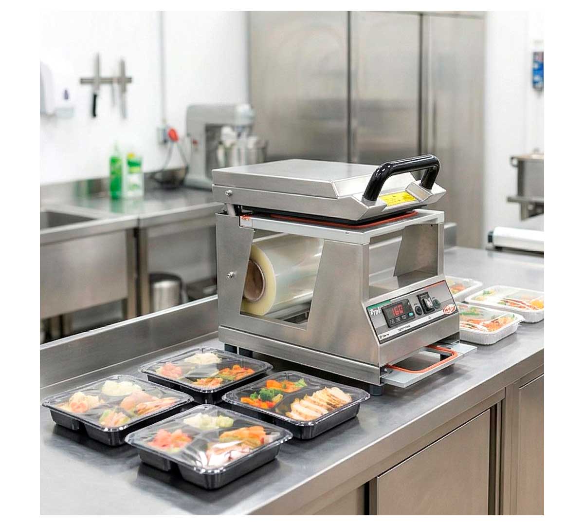 Termoselladora manual de barquetas. Permite barquetas de varias dimensiones hasta 1/2 gn. Los moldes son intercambiables según las barquetas utilizadas, pueden ser de un agujero único o multi agujero. Dispone de regulación electrónica de la temperatura. Está indicada para centros de producción de comida medianos a grandes, supermercados y gastronomía.