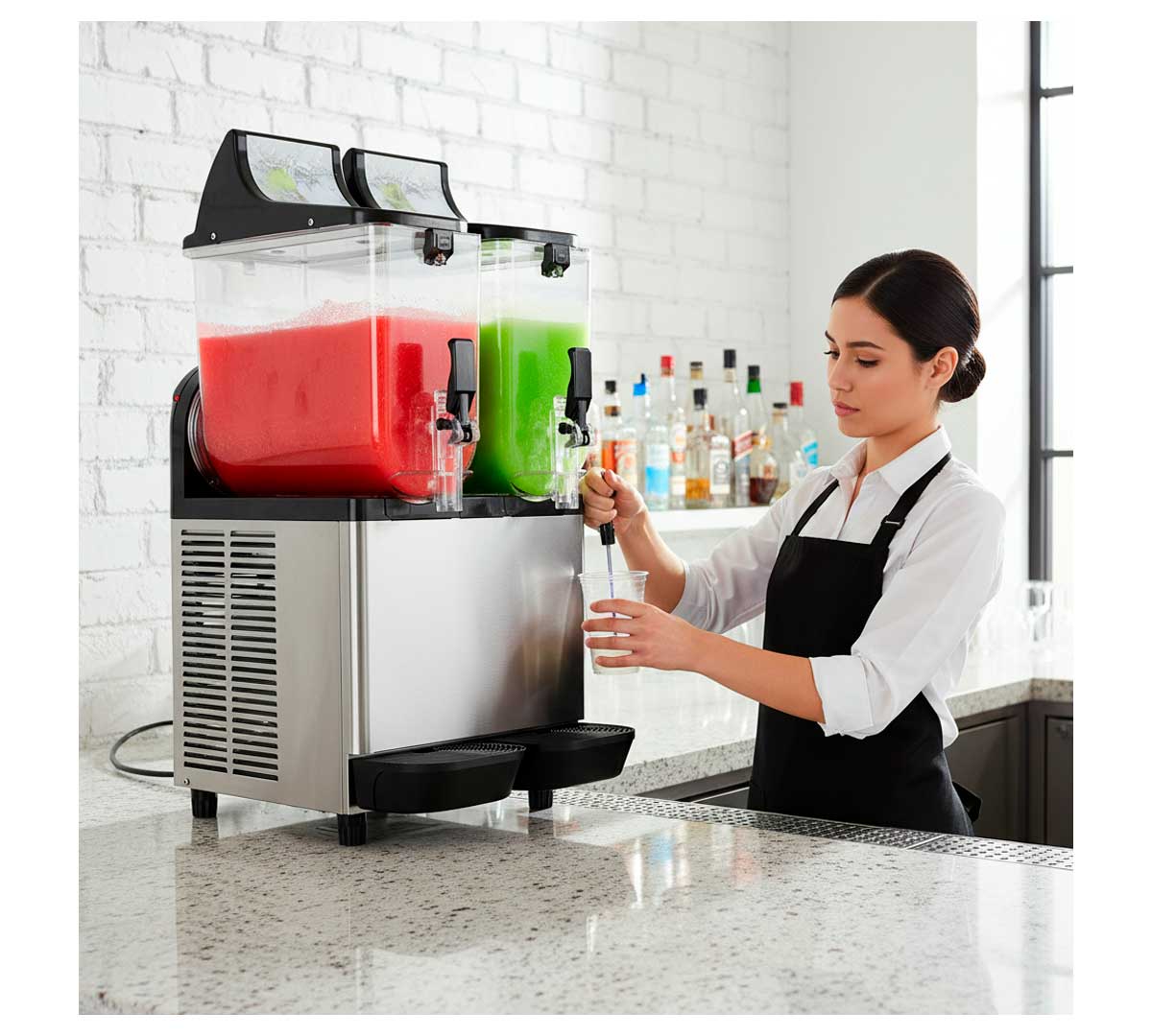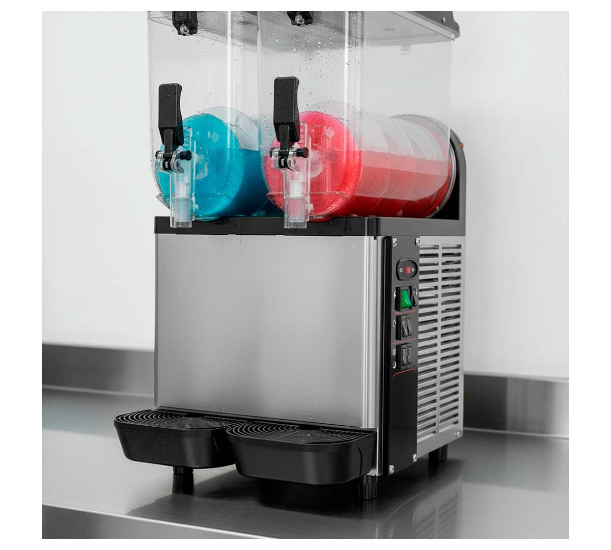Granizadora con dos depósitos de policarbonato extraíbles. Diseñada para preparar y dispensar granizados y sorbetes. La regulación de la densidad del producto es electromecánica. Con sistema de agitado horizontal y el control es digital. Tiene una capacidad total de 20 litros.