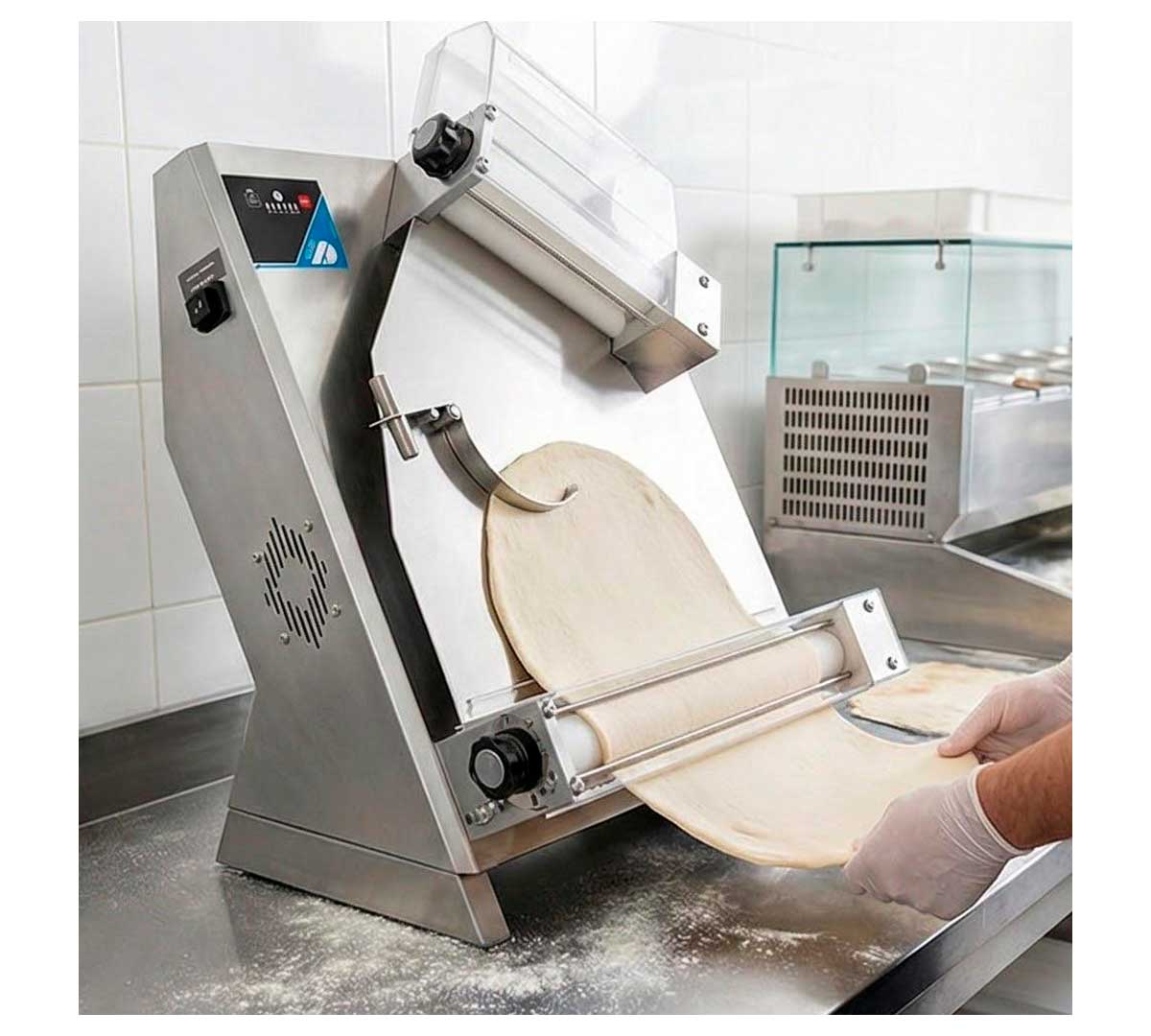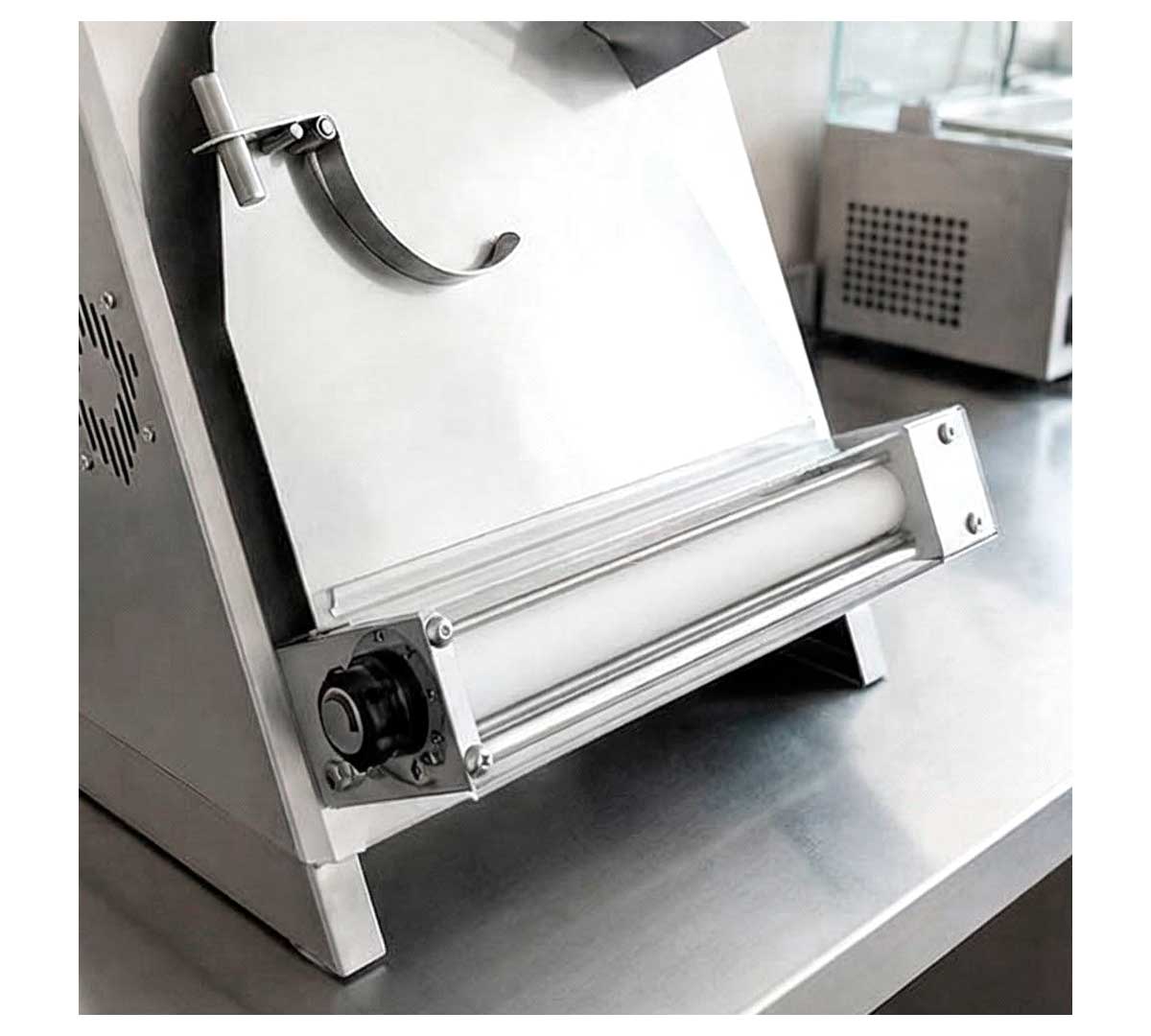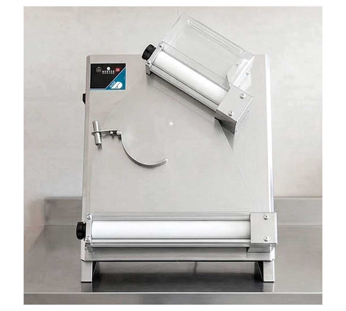Laminadora con sensor electrónico que detecta la masa al acercarla a la boca de entrada, activando los rodillos automáticamente. Tiene 2 rodillos y el rodillo superior está inclinado. Con tiempo ajustable entre 10 y 35 segundos cortando la masa al finalizar. Ideal para pizza redonda gracias al balancín central.