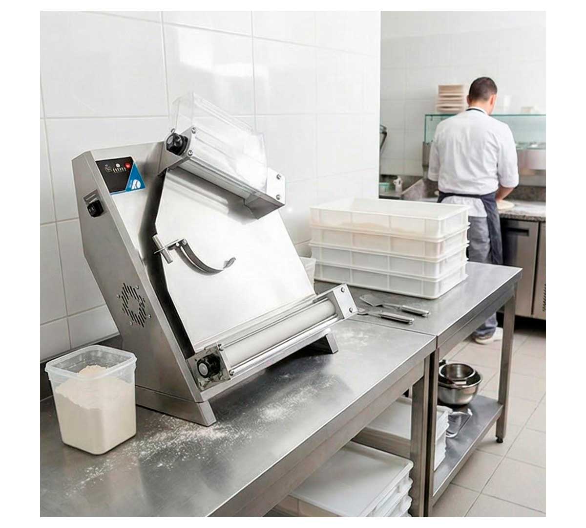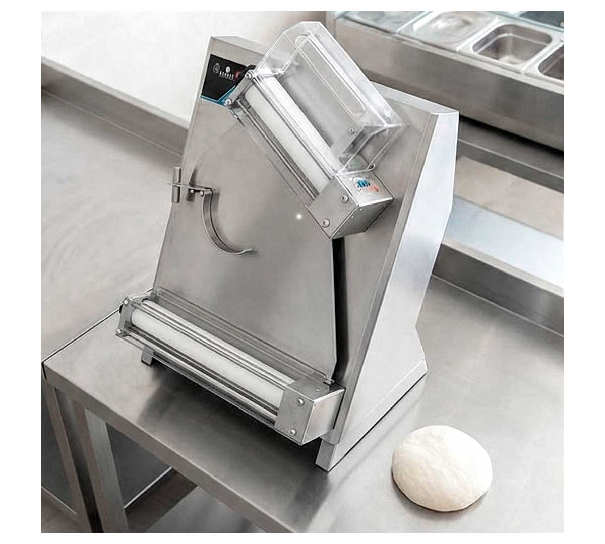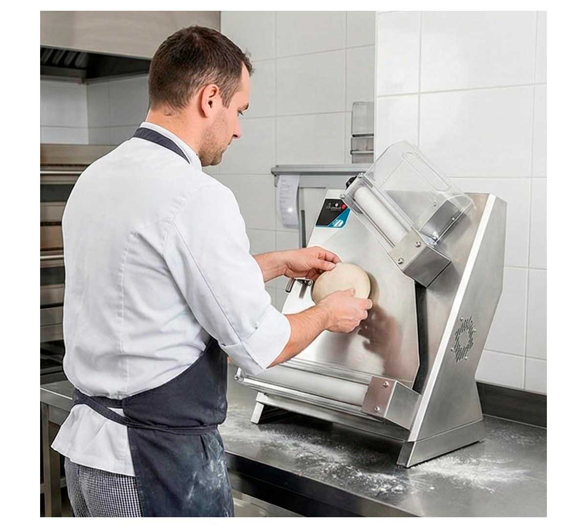 Laminadora con sensor electrónico que detecta la masa al acercarla a la boca de entrada, activando los rodillos automáticamente. Tiene 2 rodillos y el rodillo superior está inclinado. Con tiempo ajustable entre 10 y 35 segundos cortando la masa al finalizar. Ideal para pizza redonda gracias al balancín central.