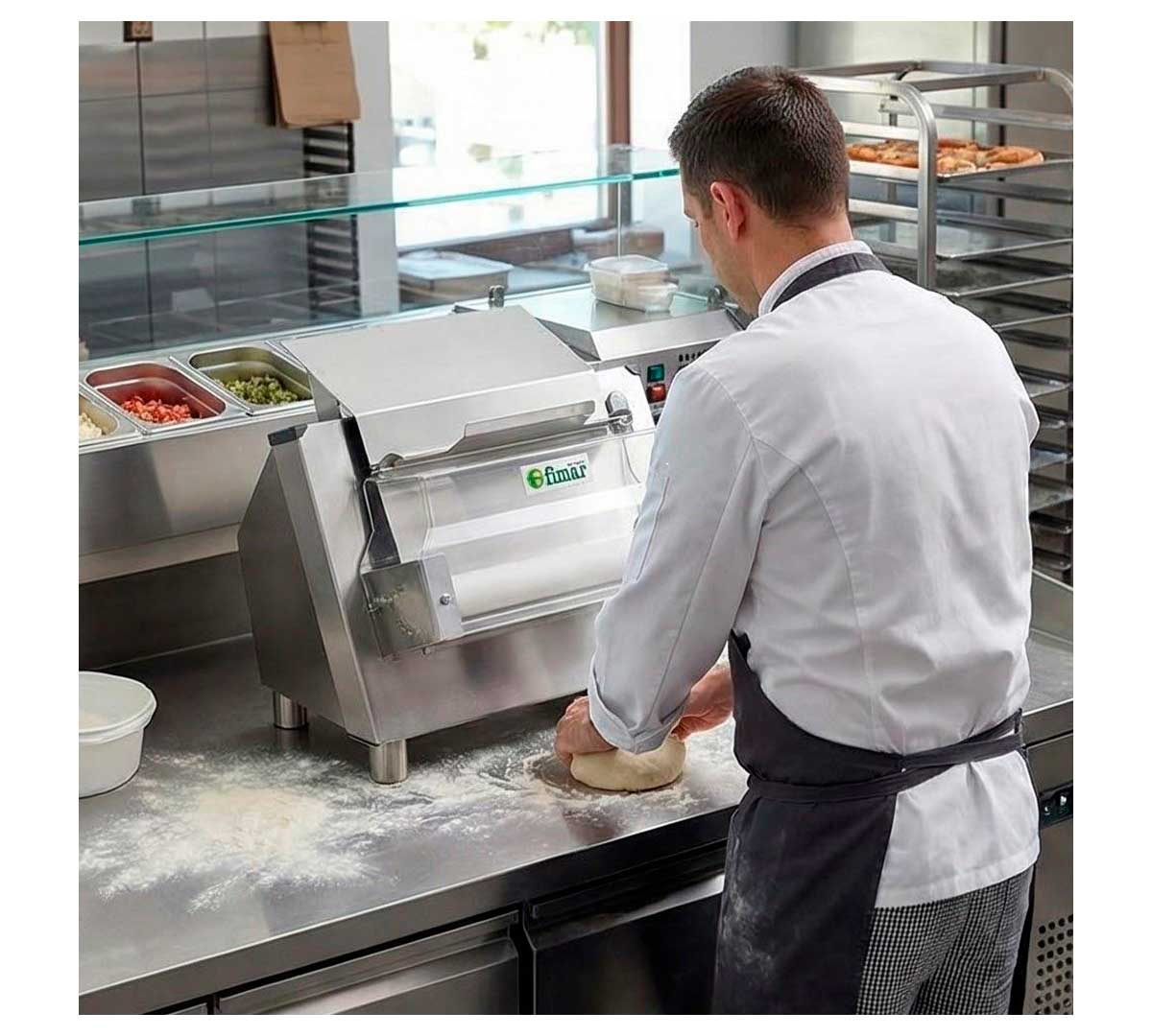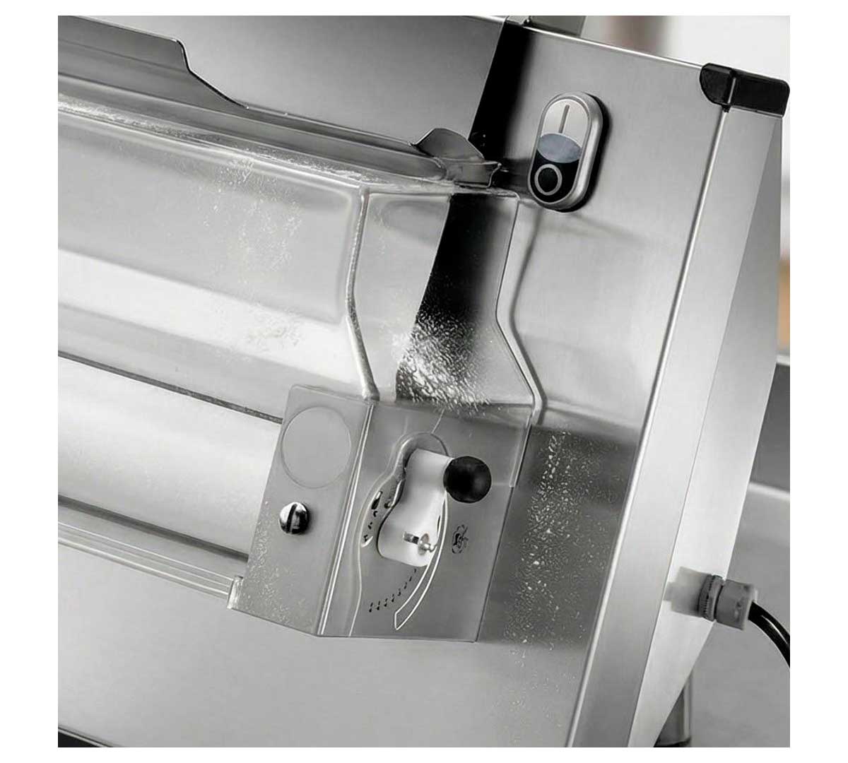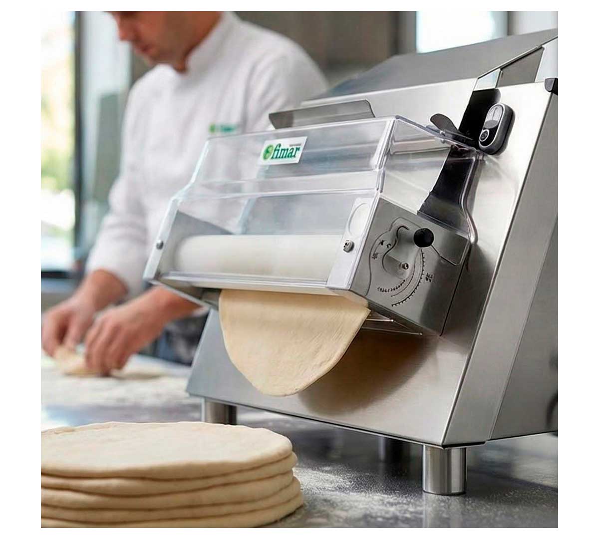 Máquina para estirar masas de pizza, pan, focaccia, etc. Tiene una única pareja de rodillos de resina. Con sistema con micro-interruptor de seguridad. La estructura es de acero inoxidable. Equipada con palanca para regular el espesor.
