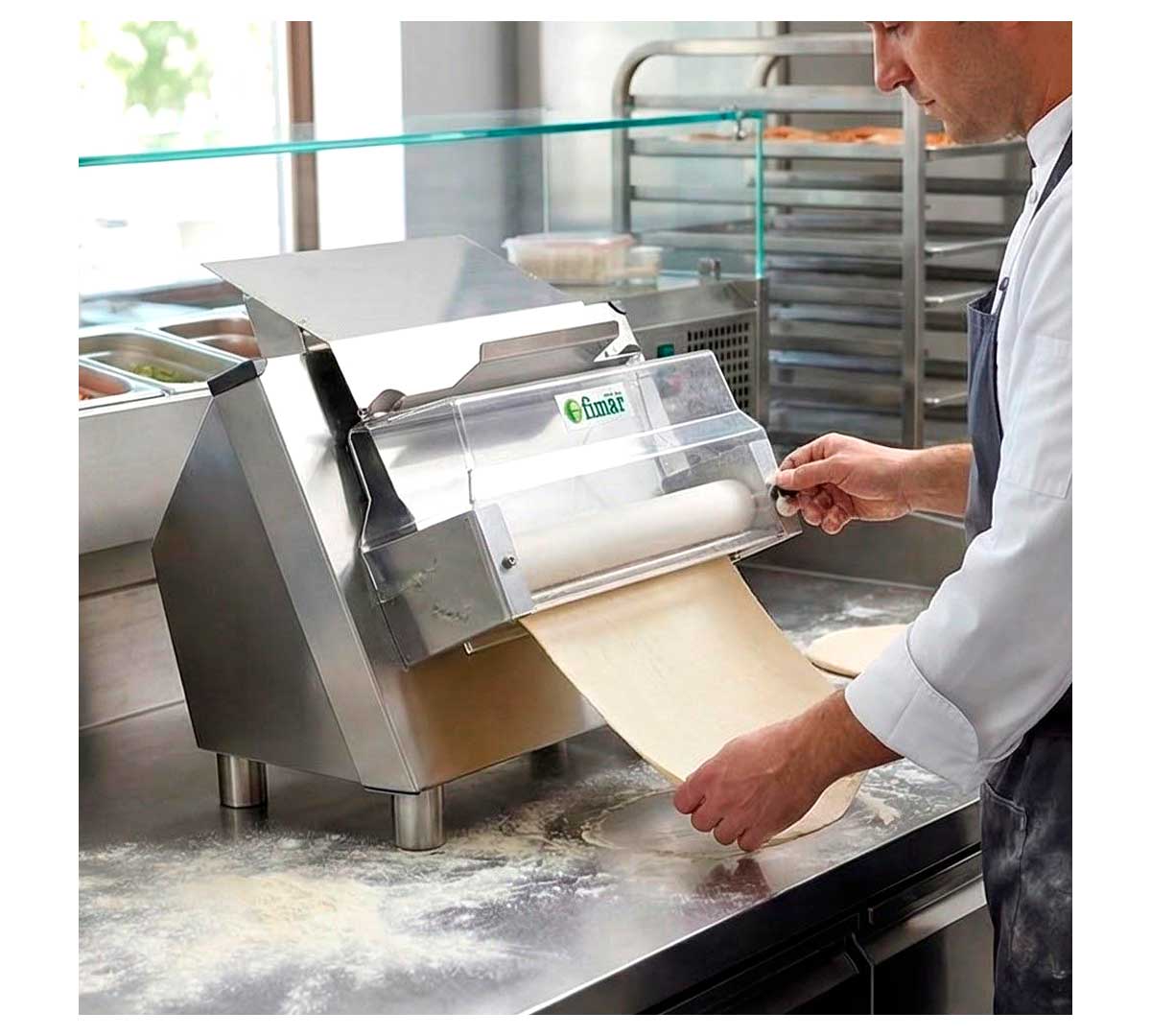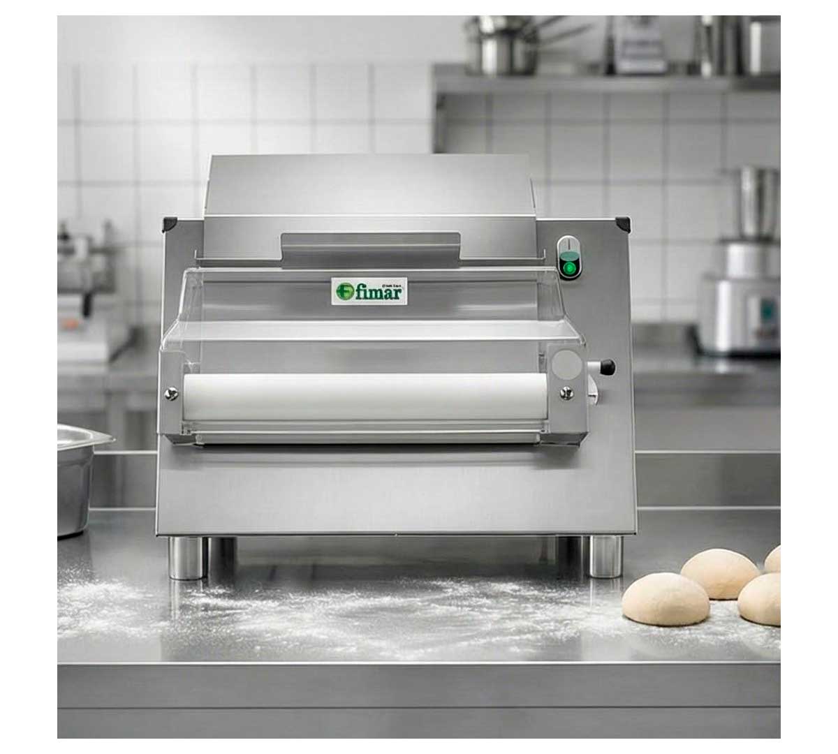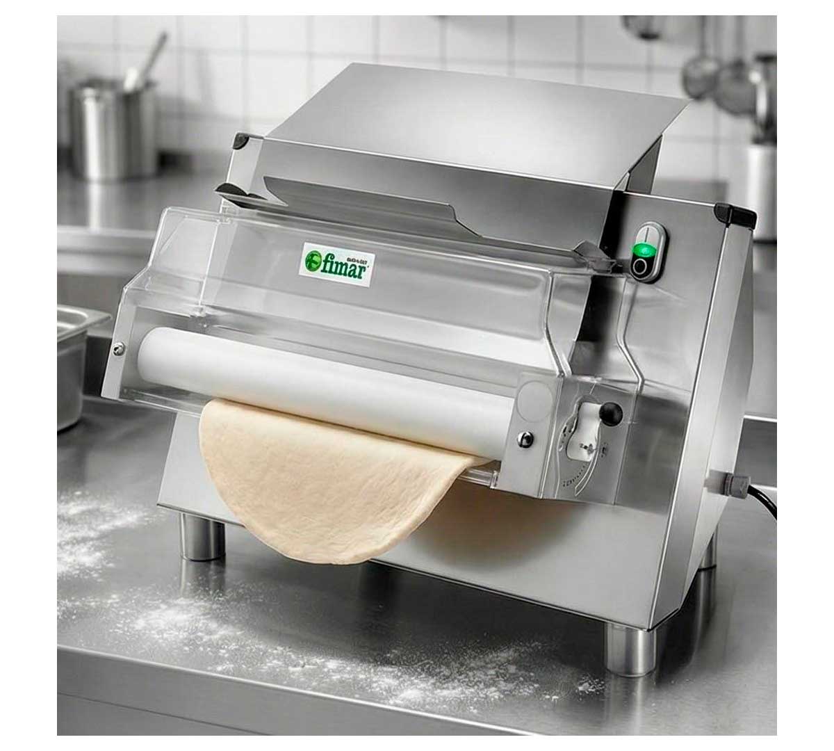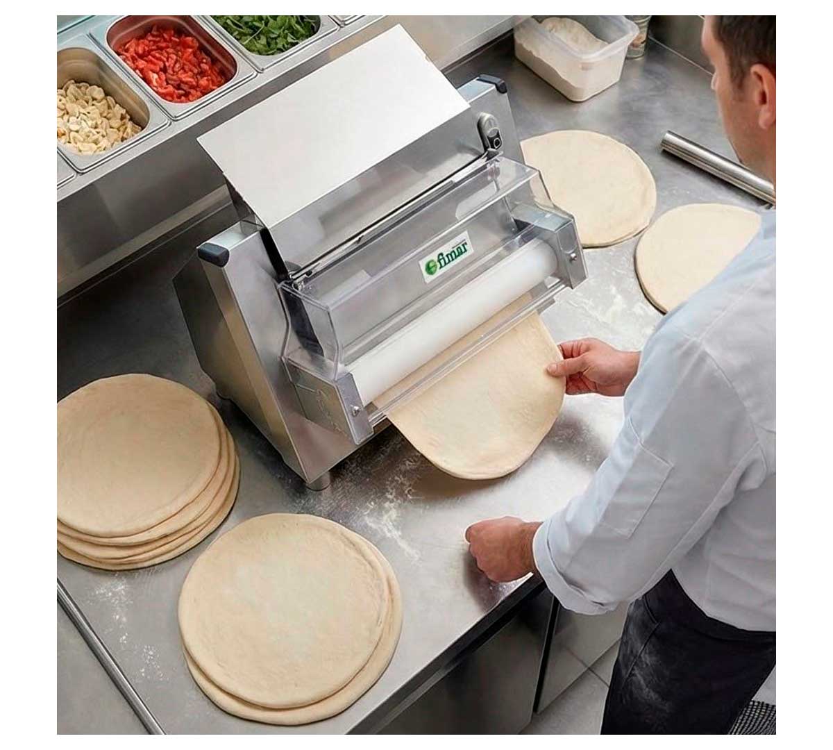 Máquina para estirar masas de pizza, pan, focaccia, etc. Tiene una única pareja de rodillos de resina. Con sistema con micro-interruptor de seguridad. La estructura es de acero inoxidable. Equipada con palanca para regular el espesor.
