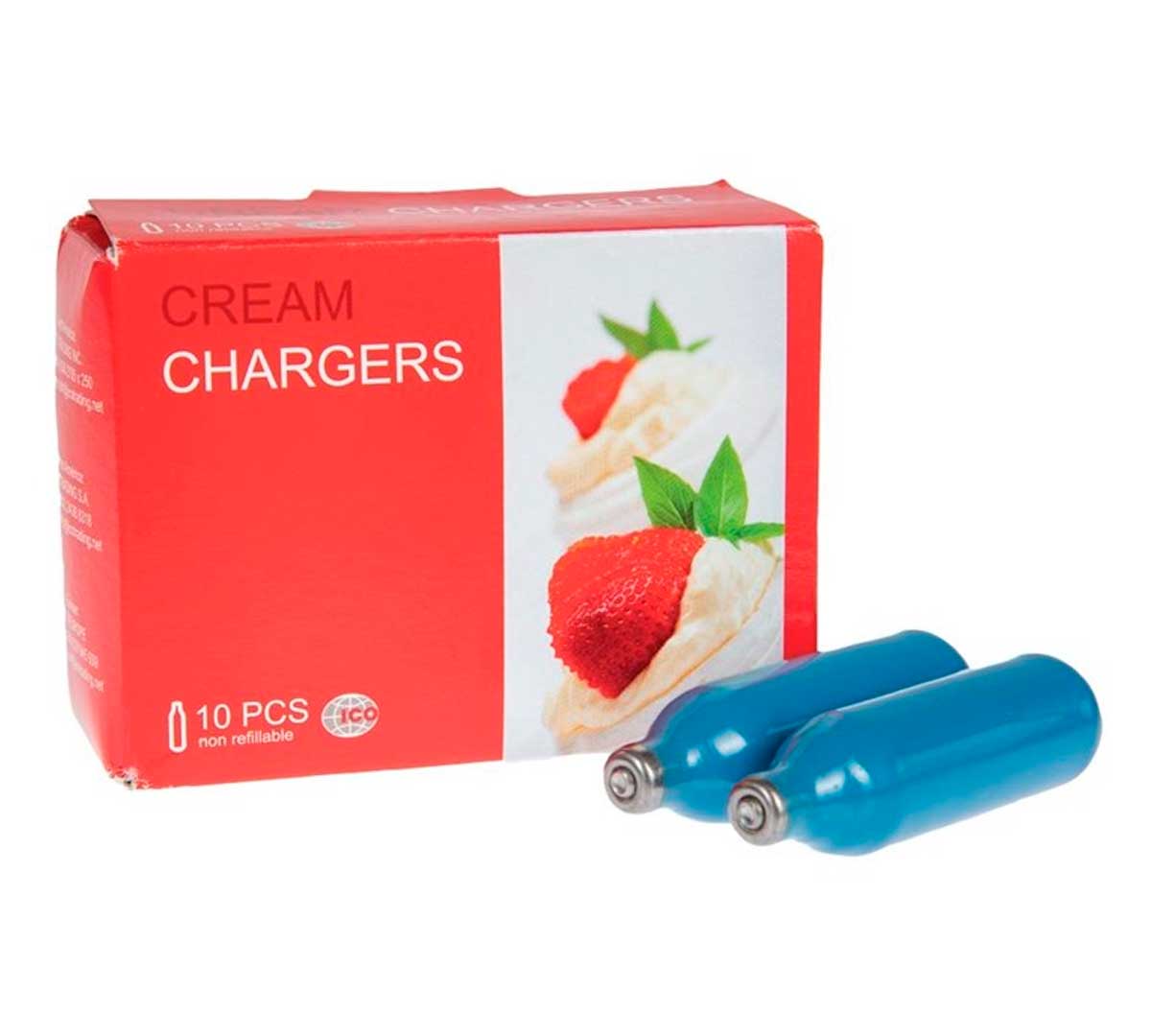 Cartuchos de gas N2O para dispensadores de crema batida. Presentados en pack de 10 unidades. Diseñados para preparar nata montada y cremas de forma rápida. Segura y profesional para uso en Hostelería.