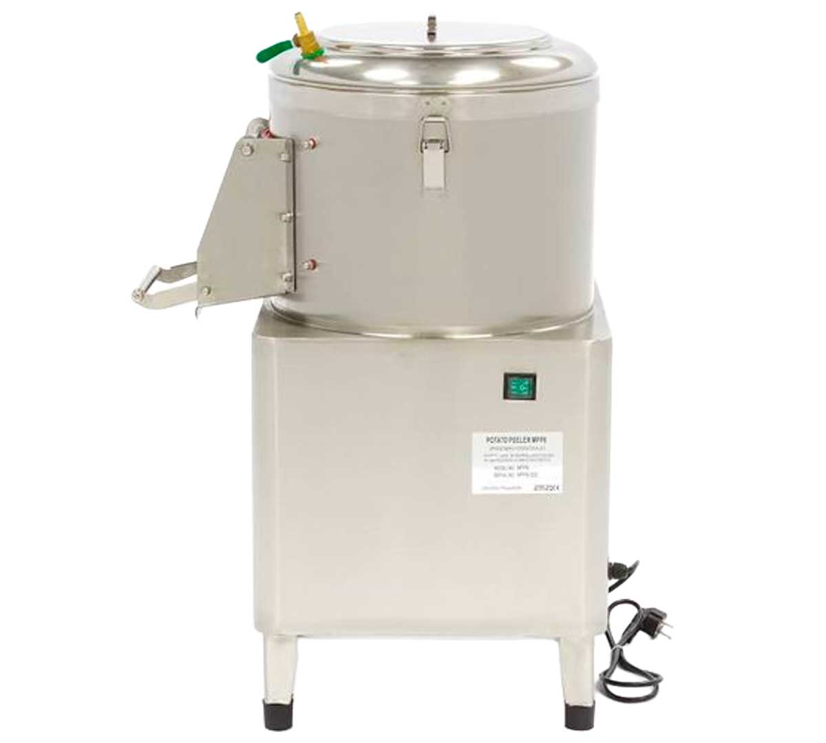 Peladora de patatas profesional de 8 kg por ciclo con productividad de hasta 160 kg/h y motor de 370 W. Sistema abrasivo con plato y pared lateral desmontables. Diseñada para cocinas profesionales y catering que requieren rapidez y uniformidad en la preparación diaria.