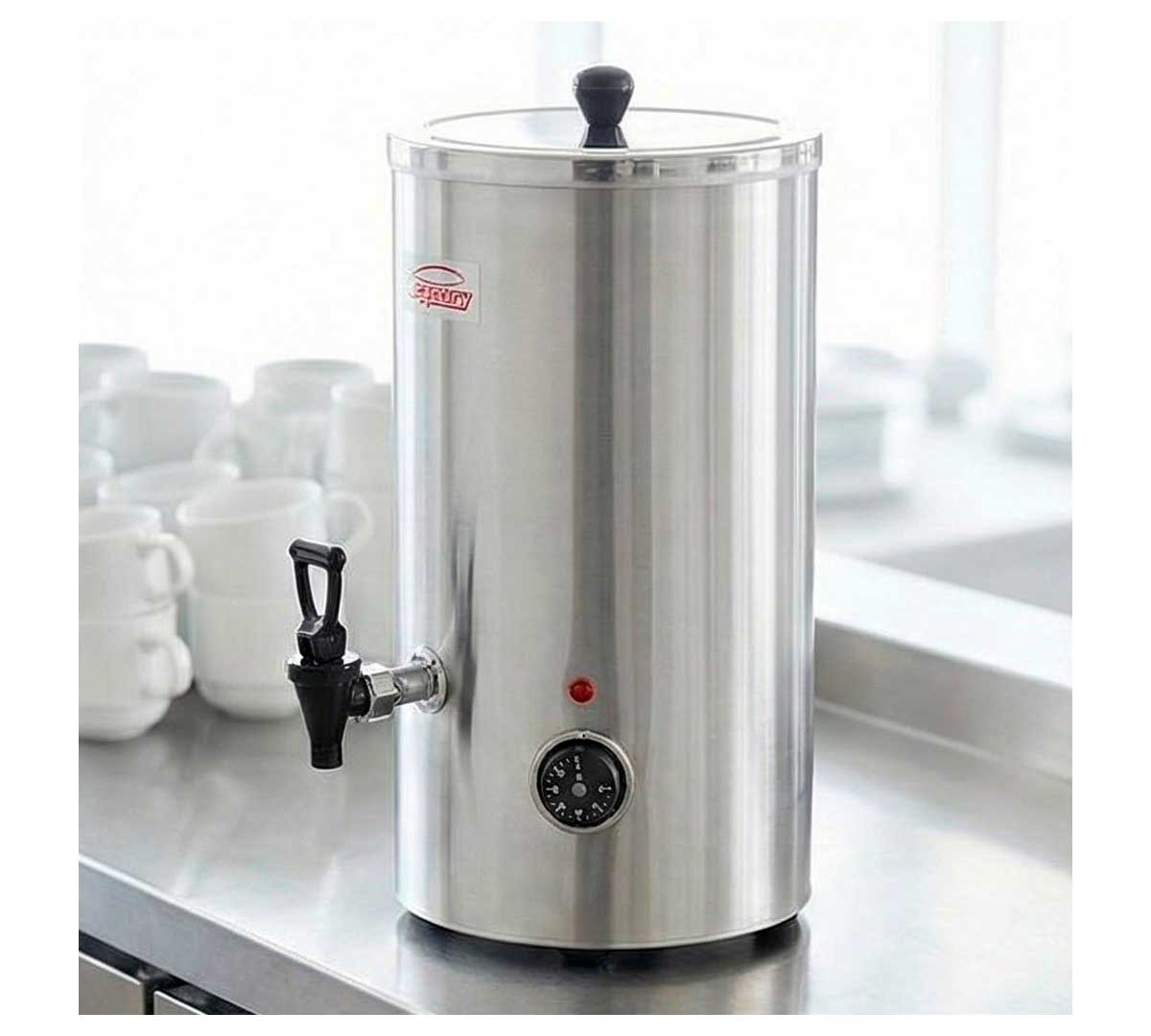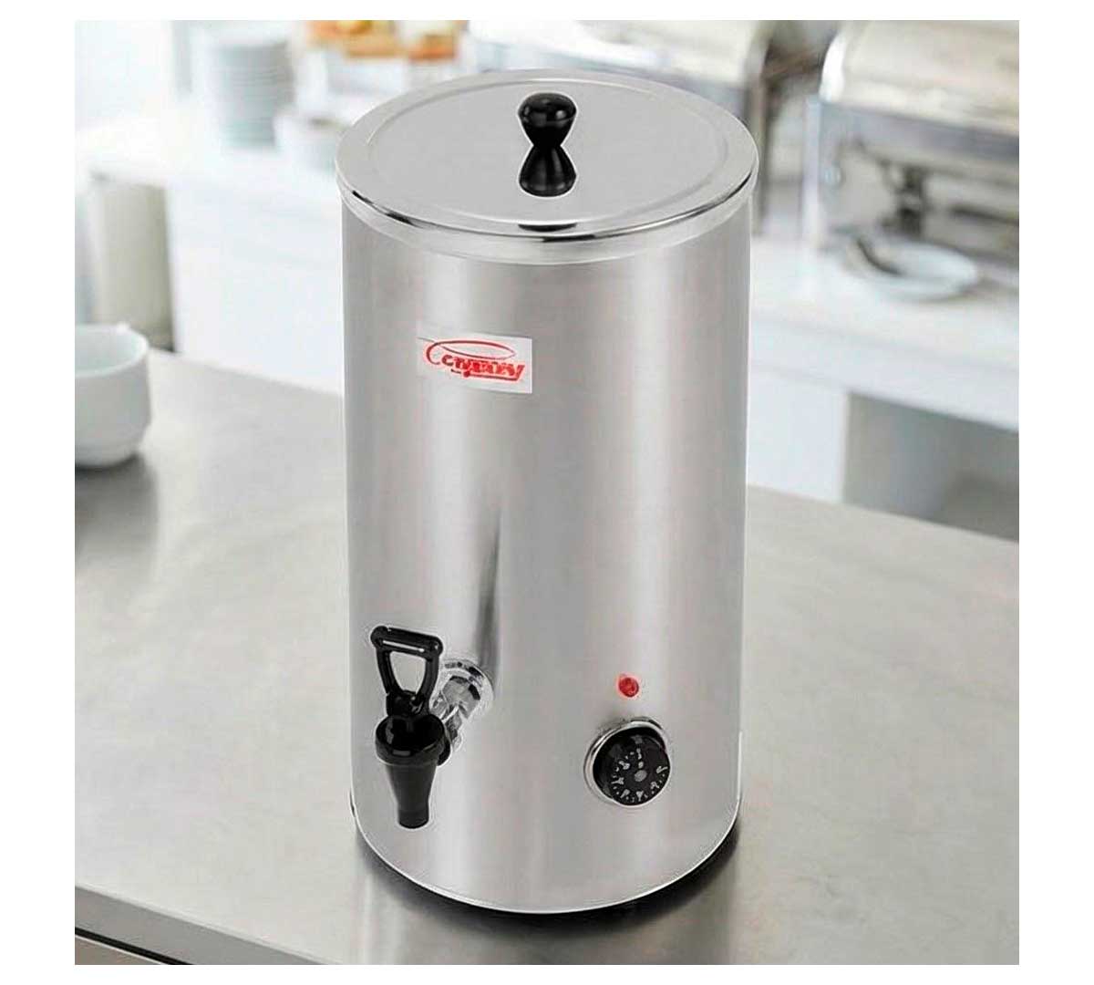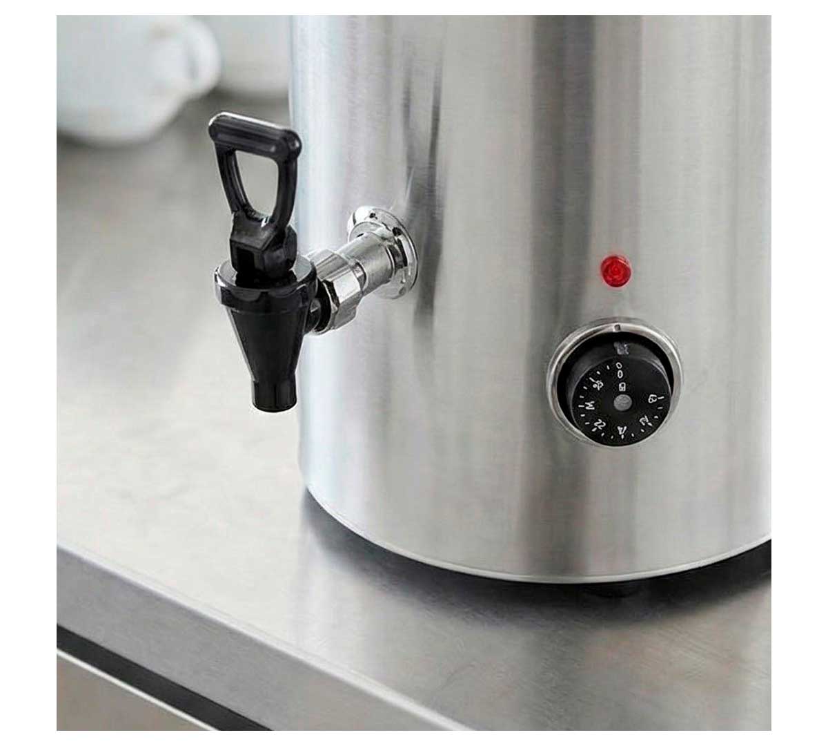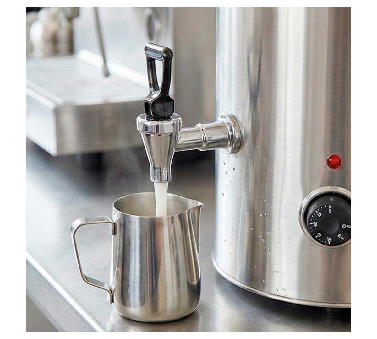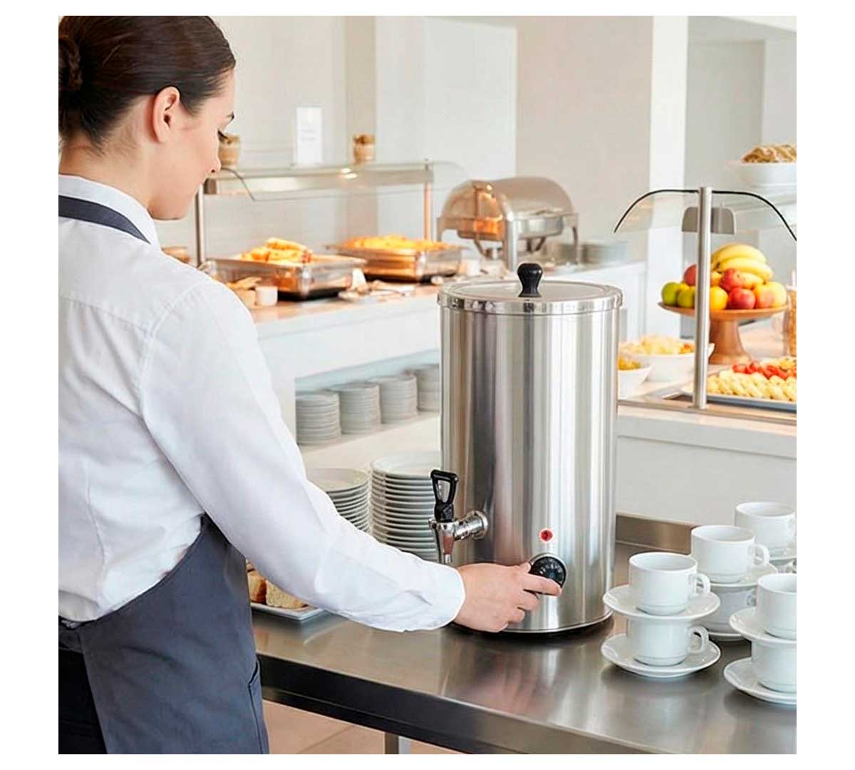 Termo al baño maría de 6 litros con aislamiento térmico. Calienta los líquidos conservando sus propiedades. Es Ideal para leche, caldo, té y agua. Está equipado con grifo anti-goteo de doble posición y control de temperatura por termostato.