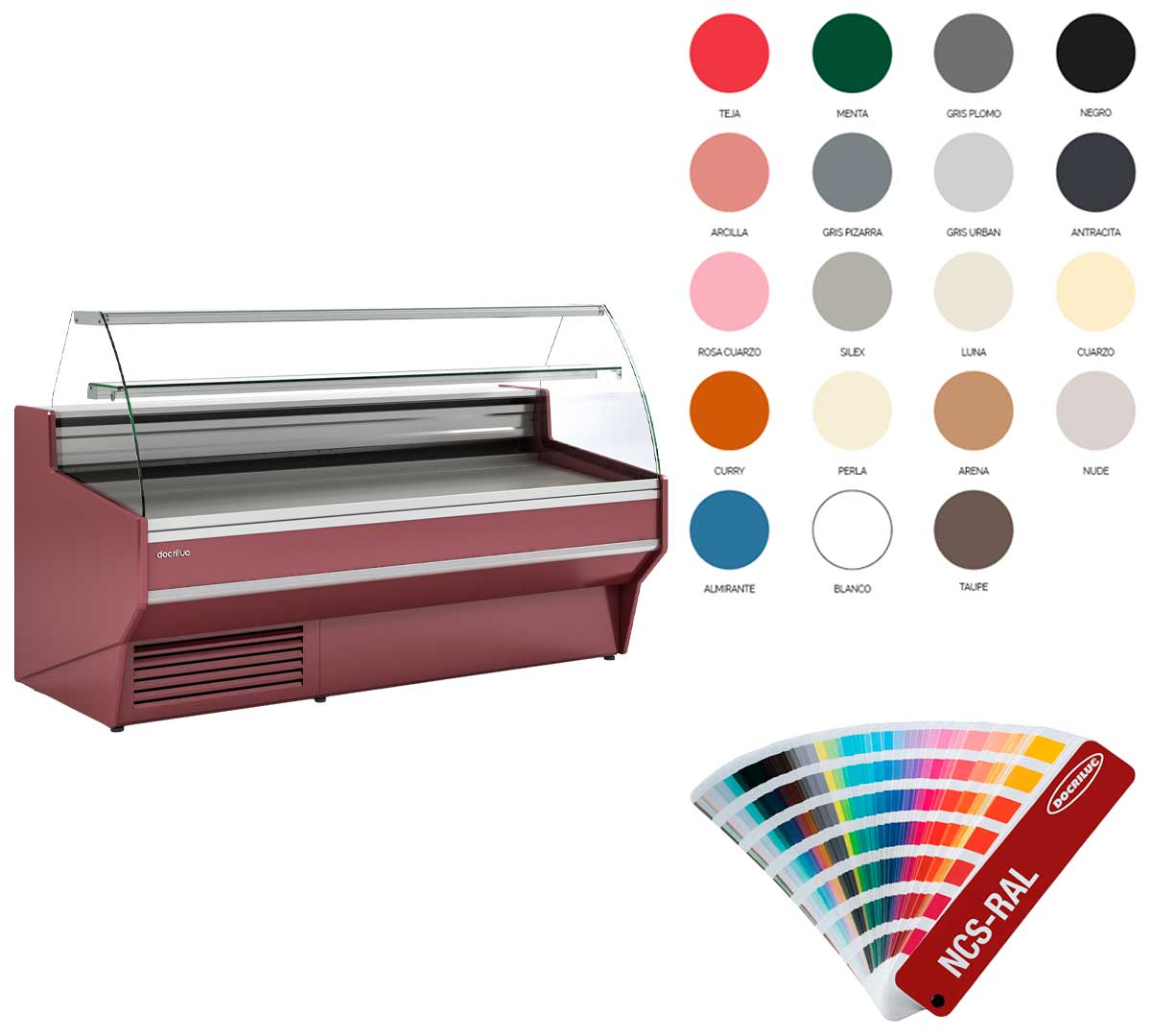 Vitrina expositora refrigerada con cristal elevable y sin estante. Está diseñada para carnicerías, charcuterías y exposición de productos lácteos. Ofrece un rango de temperatura de 0 a +6 ºC, encimera en acero AISI-304, iluminación LED y control electrónico. Incluye reserva refrigerada y enchufe auxiliar con capacidad máxima de carga de 500 W. La franja frontal está disponible en 19 colores. Los laterales y la parte frontal inferior son de color antracita.