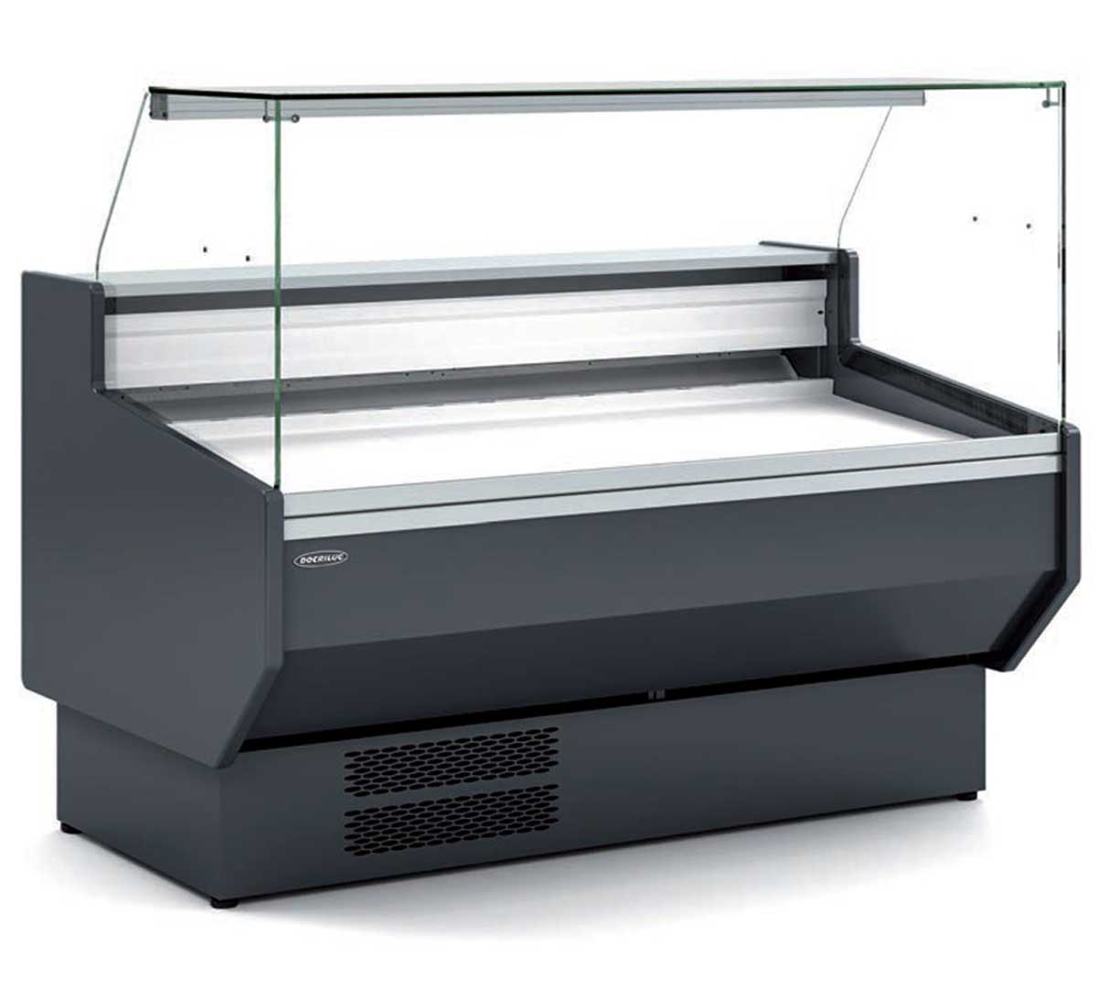Vitrina expositora con cristal recto, sin estante y con frontal abatible. Está diseñada para carnicerías, charcuterías o exposición de lácteos. La estructura es de acero plastificado. Con encimera de acero inoxidable, perfilería de aluminio lacado, iluminación LED y control electrónico. El frontal superior está disponible en 8 colores. Los laterales y la parte frontal inferior son de color antracita.