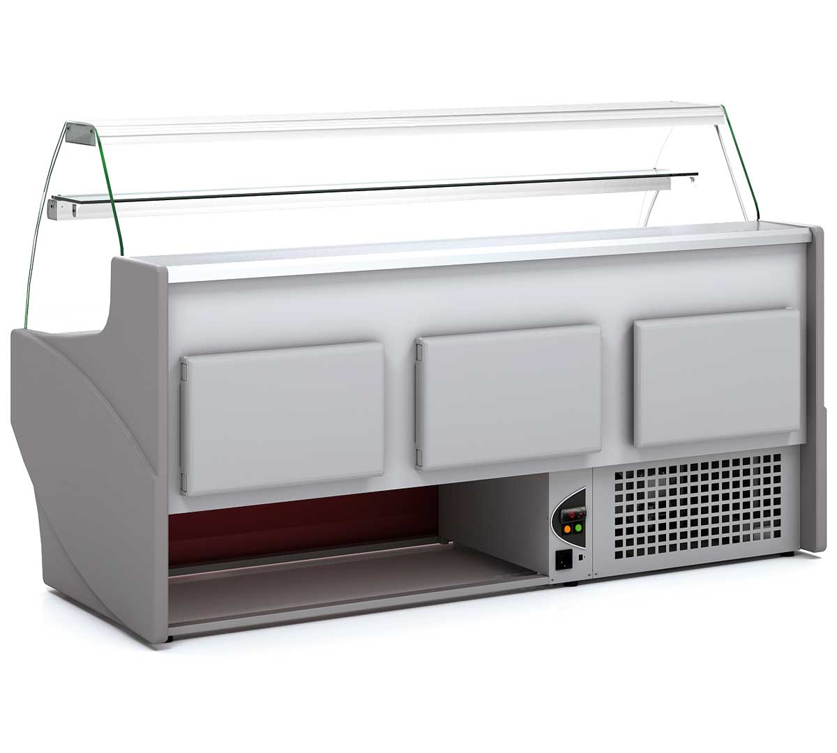 Vitrina expositora con cristal curvo y frontal abatible. Diseñada para carnicerías, charcuterías o exposición de lácteos. Estructura de acero plastificado. Con iluminación LED y control electrónico. La franja frontal está disponible en 19 colores. Los laterales y la parte frontal inferior son de color antracita. Incluye 1 estante de vidrio con iluminación, no refrigerado.