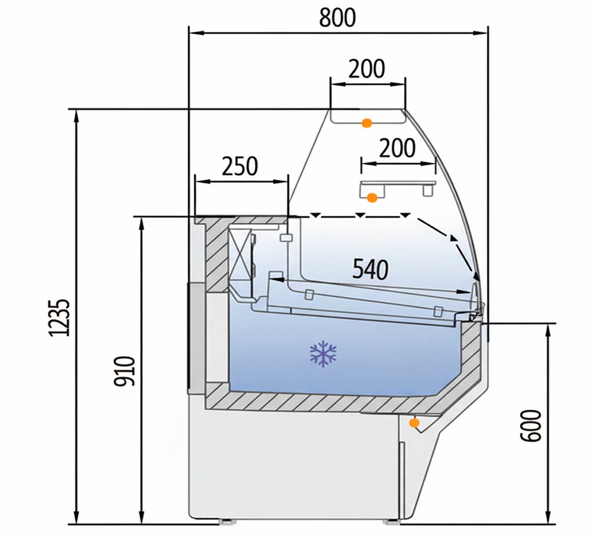 Cuenta con una reserva refrigerada con puertas de 440x270 mm (excepto modelos neutros) que permite almacenar producto adicional refrigerado, facilitando la reposición rápida sin abrir la zona de exposición constantemente.