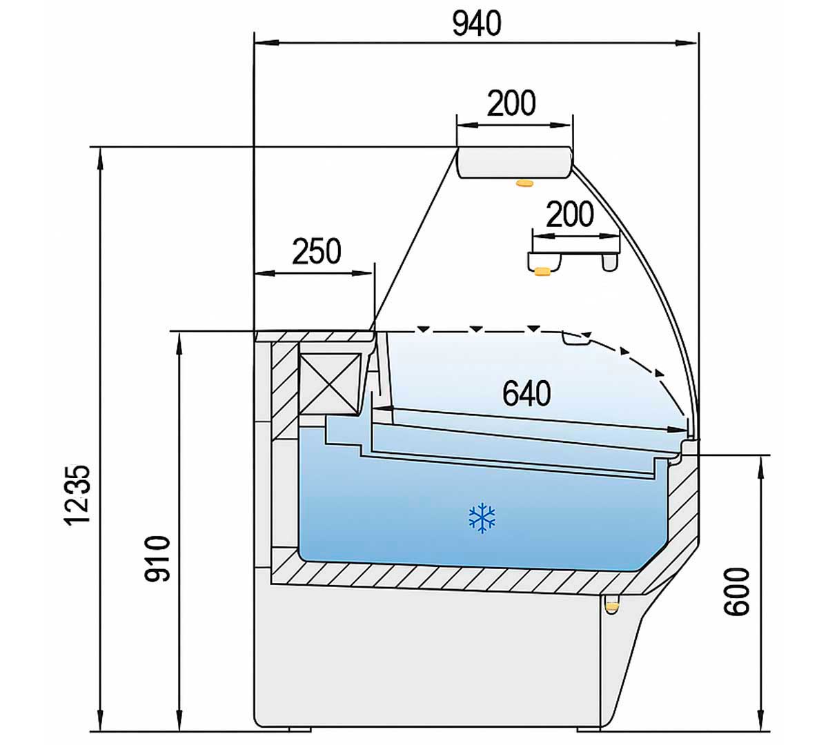 Vitrina expositora con cristal curvo y frontal abatible. Diseñada para carnicerías, charcuterías o exposición de lácteos. Estructura de acero plastificado. Con perfilería de aluminio lacado, iluminación LED y control electrónico. La franja frontal está disponible en 19 colores. Los laterales y la parte frontal inferior son de color antracita. Incluye 1 estante de vidrio con iluminación, no refrigerado.