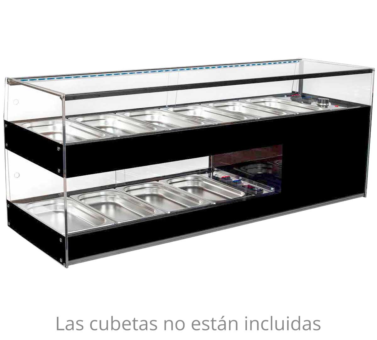 Esta vitrina no está preparada para utilizarla al baño maría. El sistema de calor es exclusivamente por calor seco mediante cable calefactor. Para una correcta instalación y funcionamiento, se recomienda seguir las indicaciones del fabricante y realizar una limpieza periódica de las guías y superficies de metacrilato.