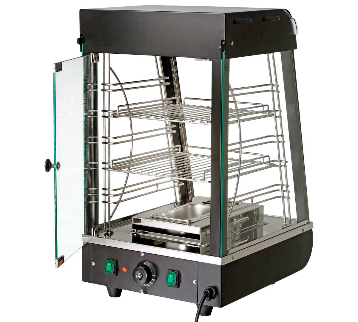 Vitrina caliente profesional de sobremesa con capacidad de 52 litros, temperatura regulable de 30 a 110 °C y sistema de humidificación por agua. Diseñada para mantener alimentos preparados calientes en bares, cafeterías y zonas de autoservicio. Incluye 3 bandejas y jarra para rellenar.
