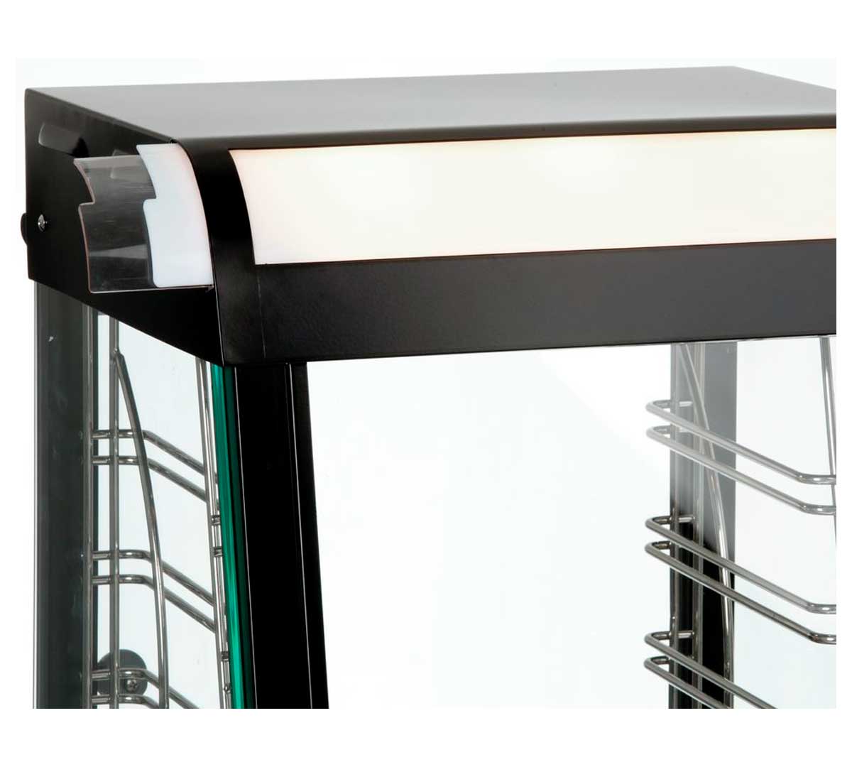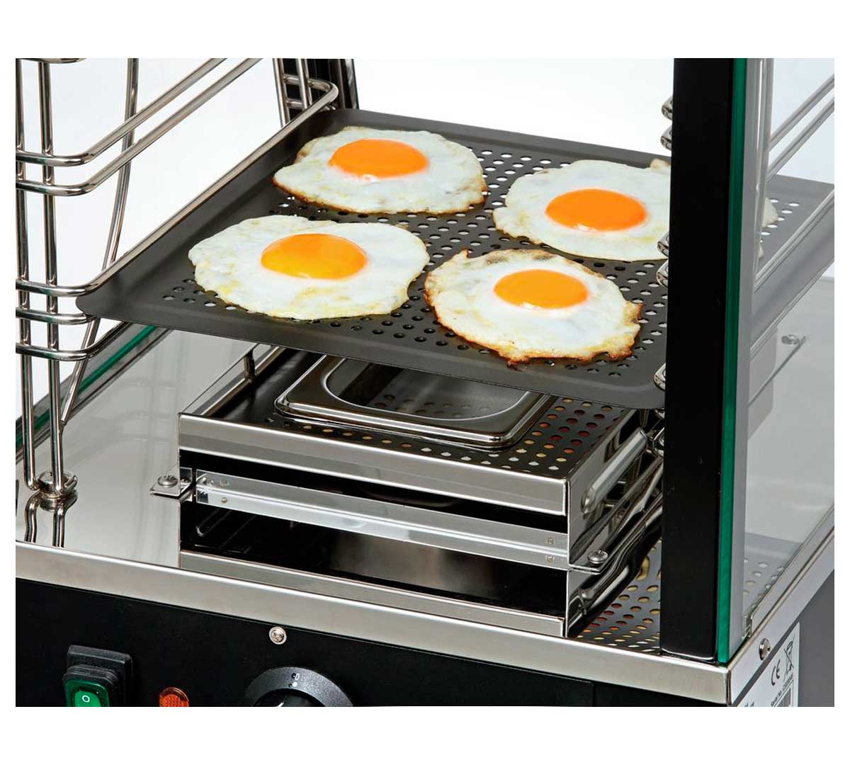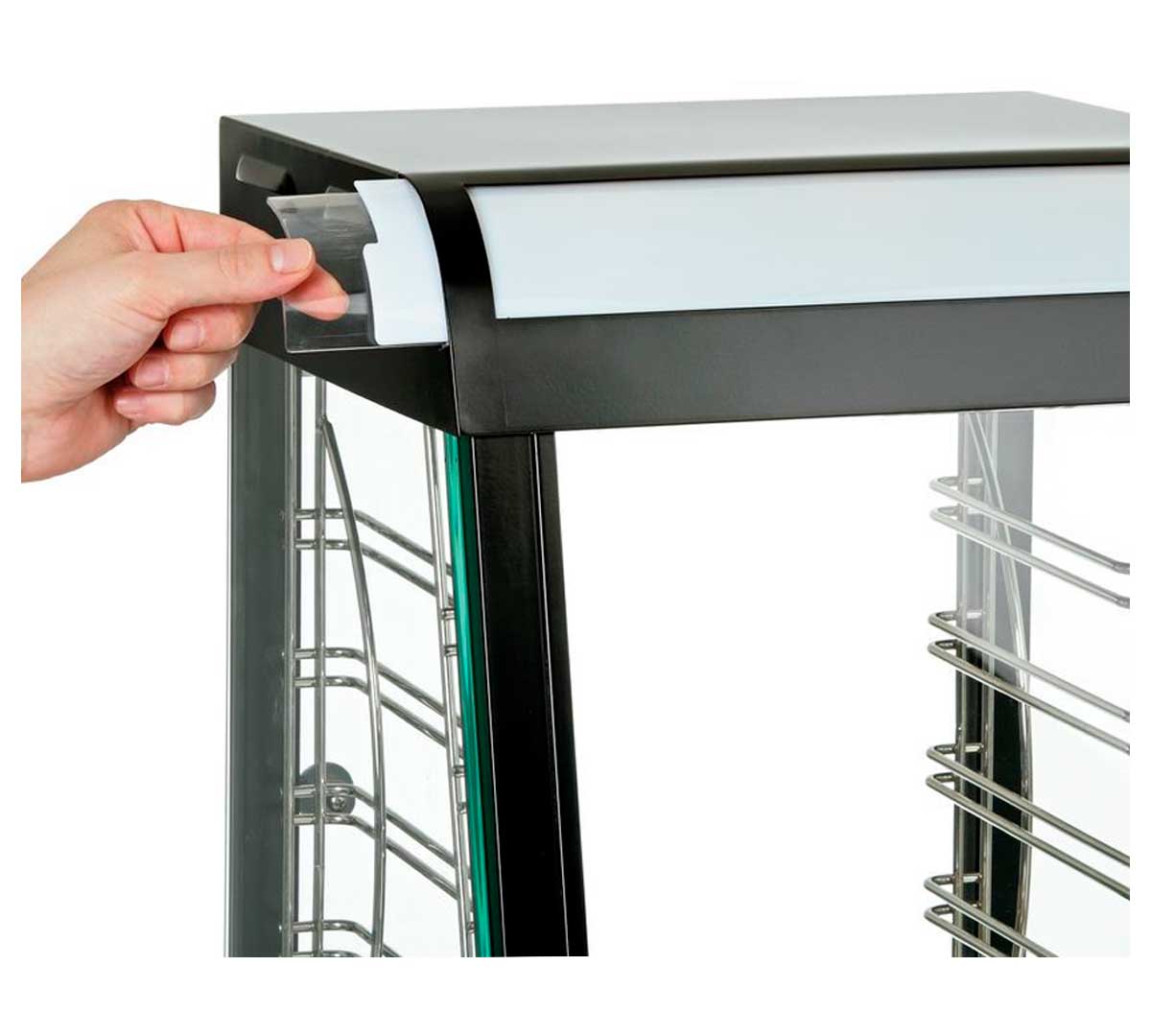 El depósito de agua integrado humidifica el aire dentro de la vitrina, evitando que los alimentos se sequen. Esto mantiene mejor la textura y frescura de las elaboraciones durante el tiempo que estén expuestas.