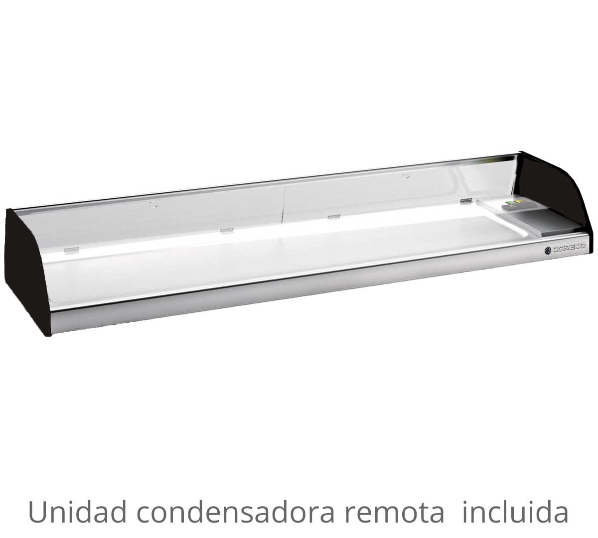 Vitrina para tapas frías con motor remoto incluido. Tiene cristal curvo templado y securizado, iluminación interior Led y descarche por control electrónico digital. Temperatura de trabajo de 4 a 8 ºC a 32 ºC ambiente. Fondo plano apto para platos, no cubetas.