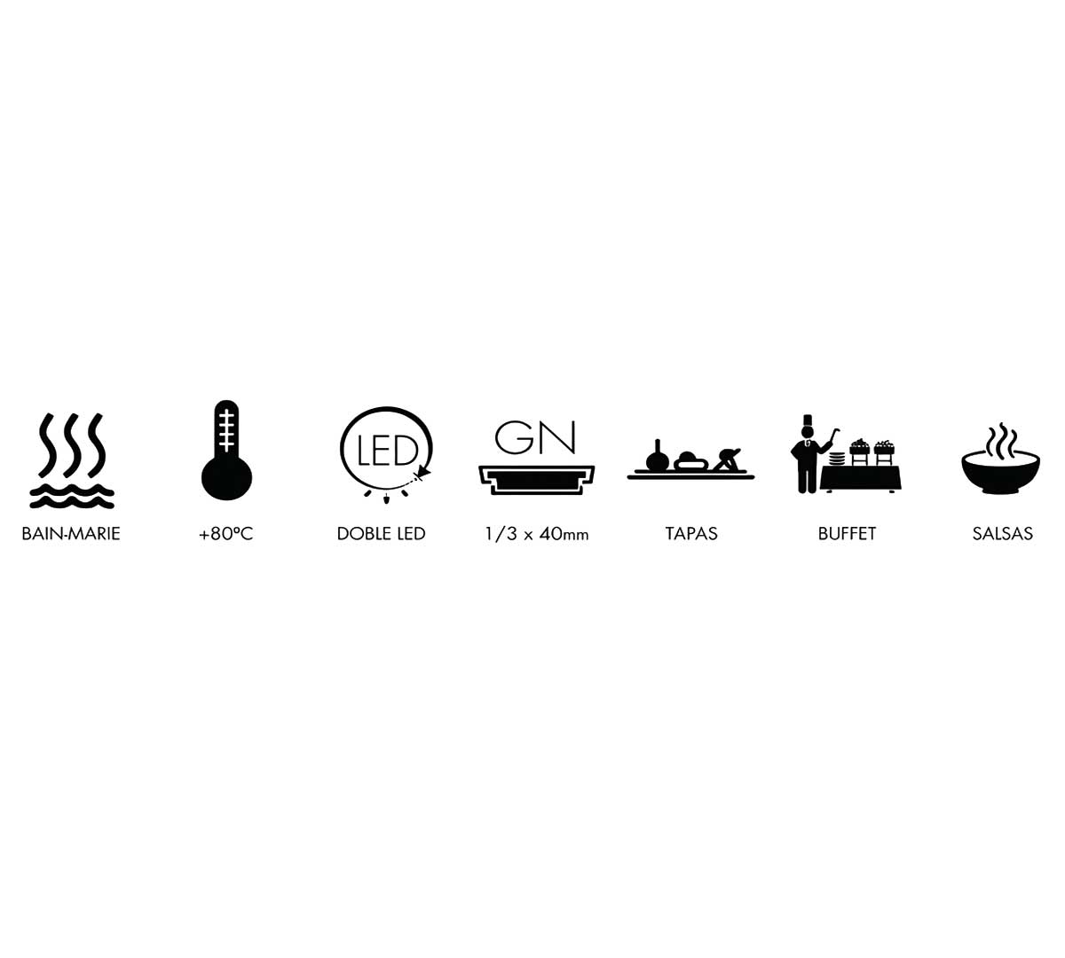 Vitrina caliente tipo baño maría diseñadas para mantener alimentos a 80 ºC. Perfectas para tapas, salsas o platos preparados en buffet y autoservicio. Con iluminación LED. Está disponible en 2 tamaños. Las cubetas GN 1/3 están incluidas.