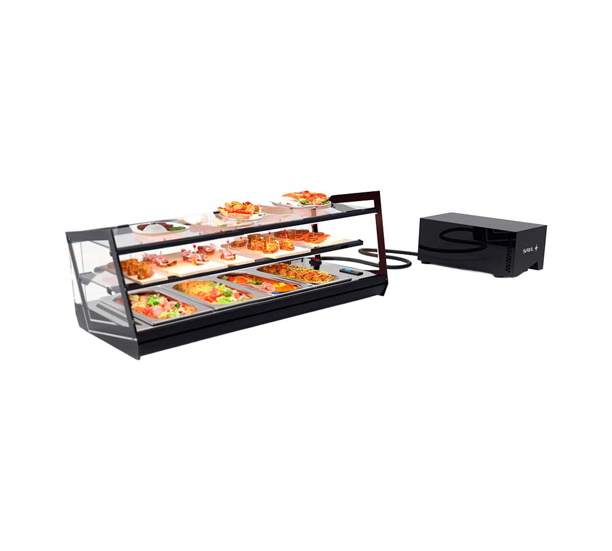 Vitrina modular refrigerada con grupo remoto. Ideal para exponer tapas, ensaladas o fruta. Disponible en tres tamaños, con cristal templado y doble iluminación LED. Incluye grupo frigorífico y un cable de 2 metros. Las cubetas GN 1/3 también están incluidas.