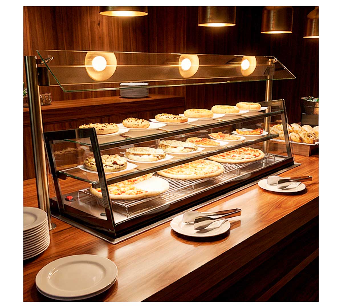 La Vitrina Calientes Kube Sahara de Sayl con sistema de calor seco que conserva productos como tapas, bollería, pizzas o churros a temperatura constante, sin los requisitos de mantenimiento del baño maría.