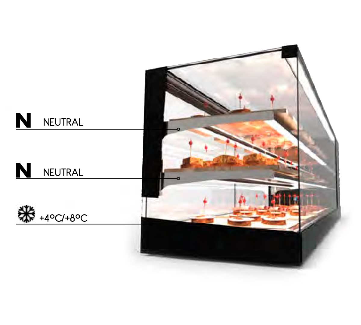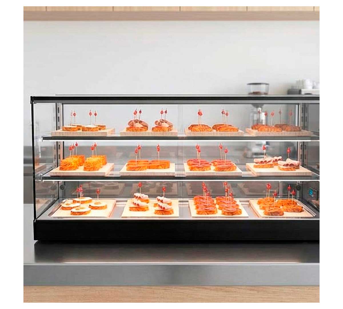 Vitrina horizontal refrigerada. El fondo es plano y permite colocar platos. Con control digital de la temperatura. Las puertas traseras son correderas. Tiene 3 niveles de exposición y 2 estantes neutros. Con cristal recto vitrificado resistente a golpes, roces, ácidos y detergentes.