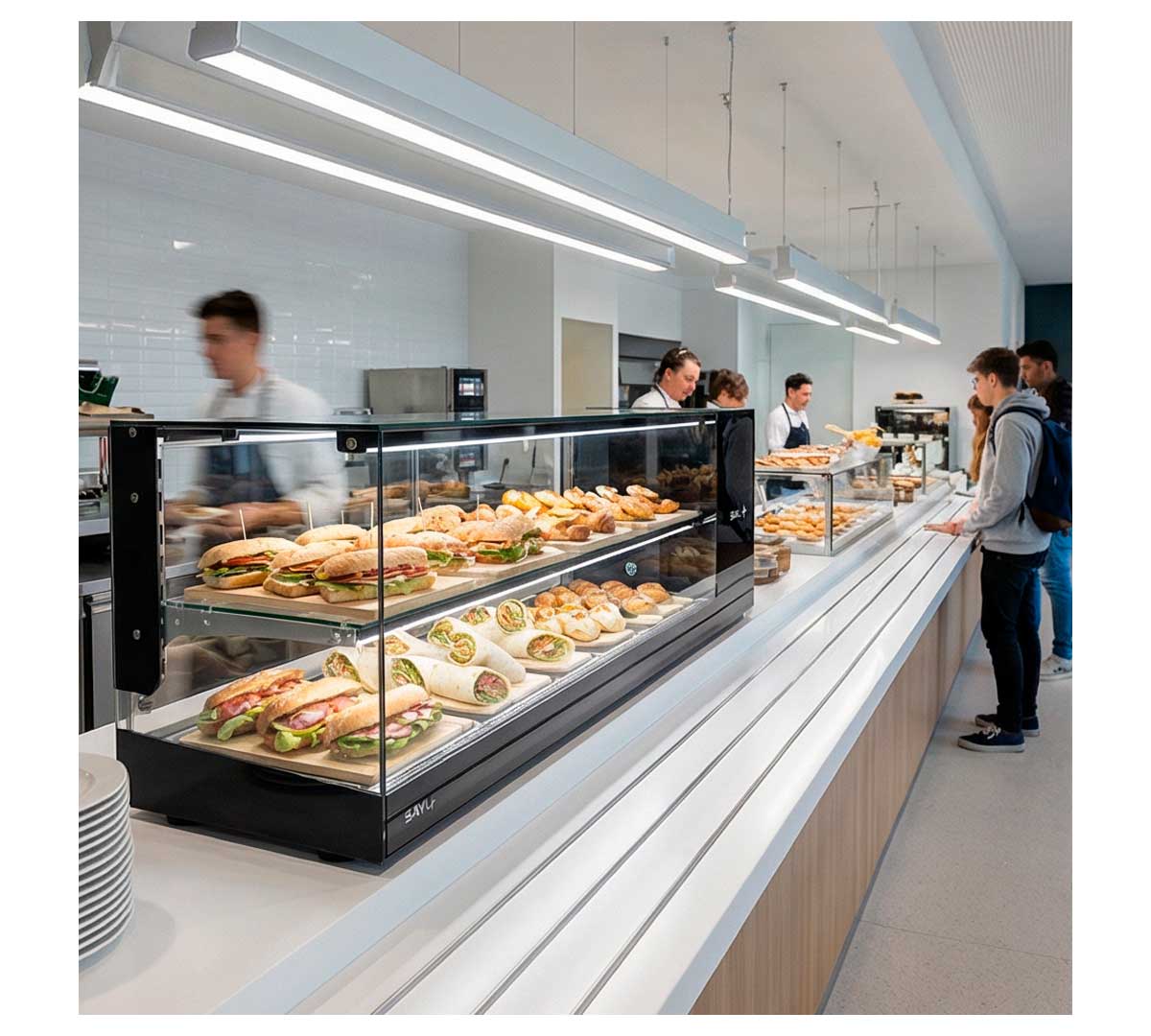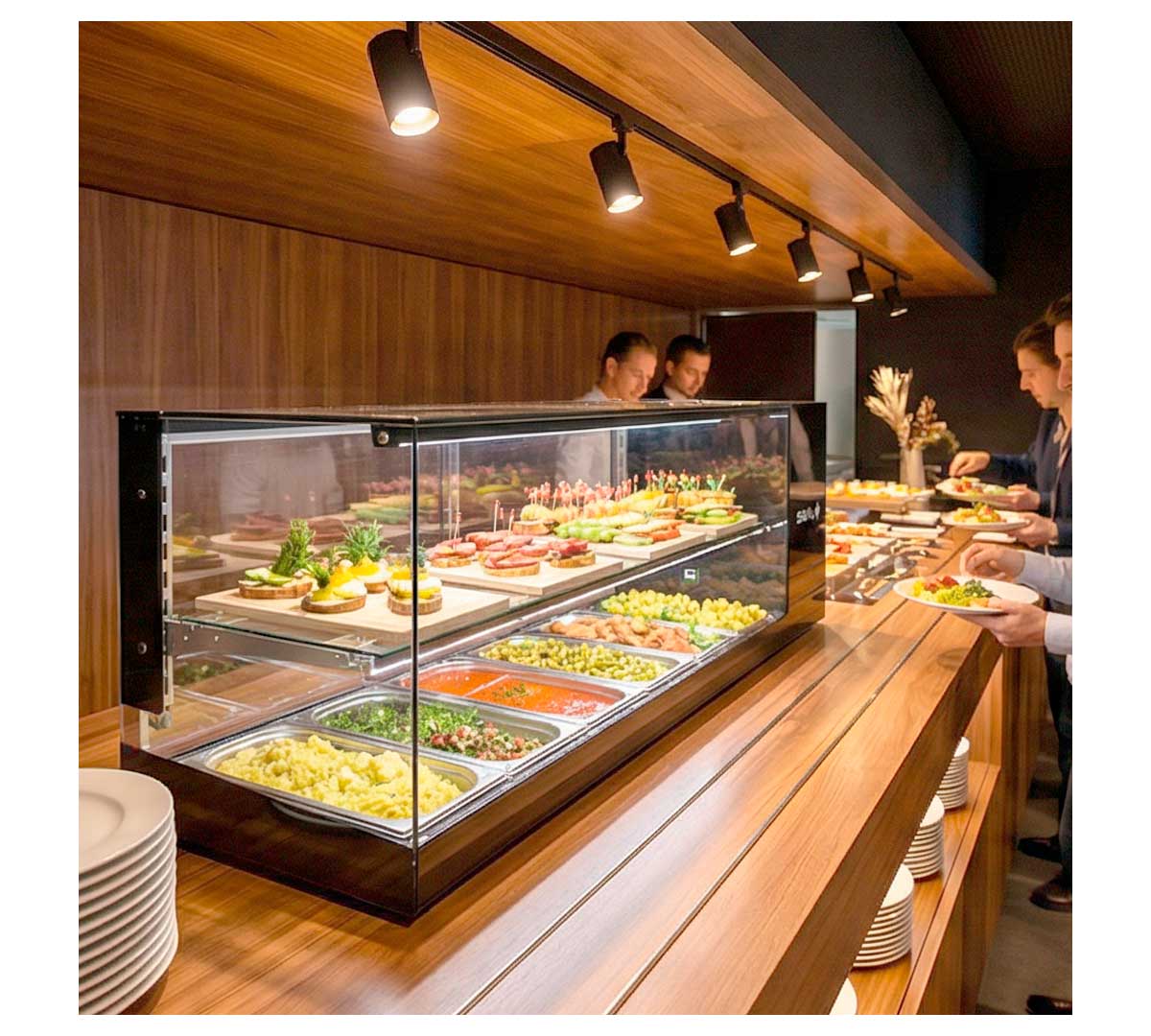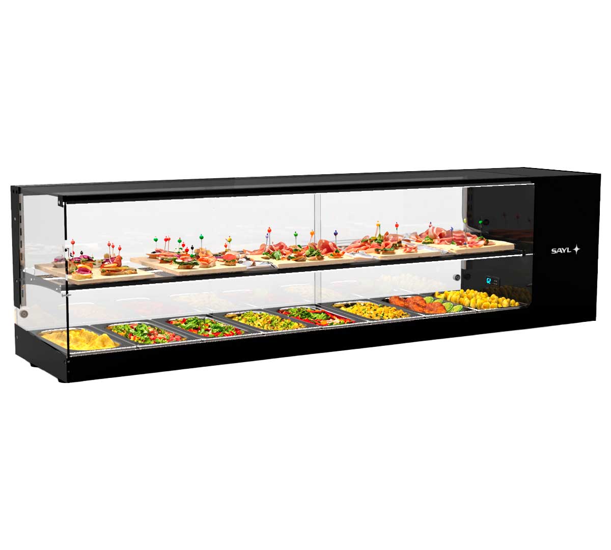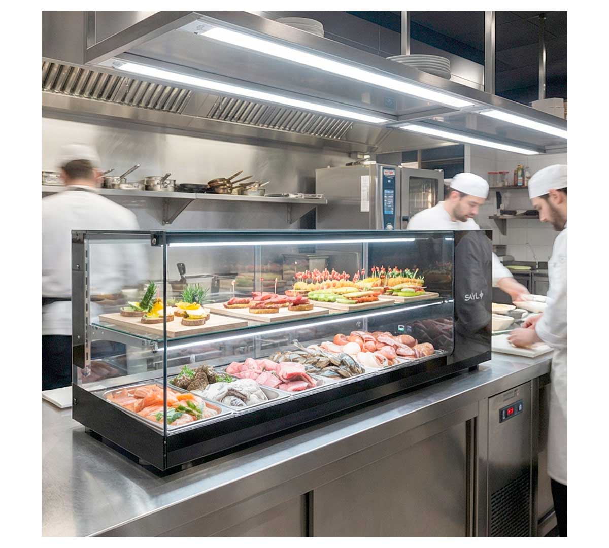 Su superficie superior plana permite aprovechar el espacio y facilita la integración en cualquier barra o encimera. Además, la doble iluminación LED en cada nivel realza la visibilidad de los platos o ingredientes expuestos, asegurando una presentación atractiva en todo momento.