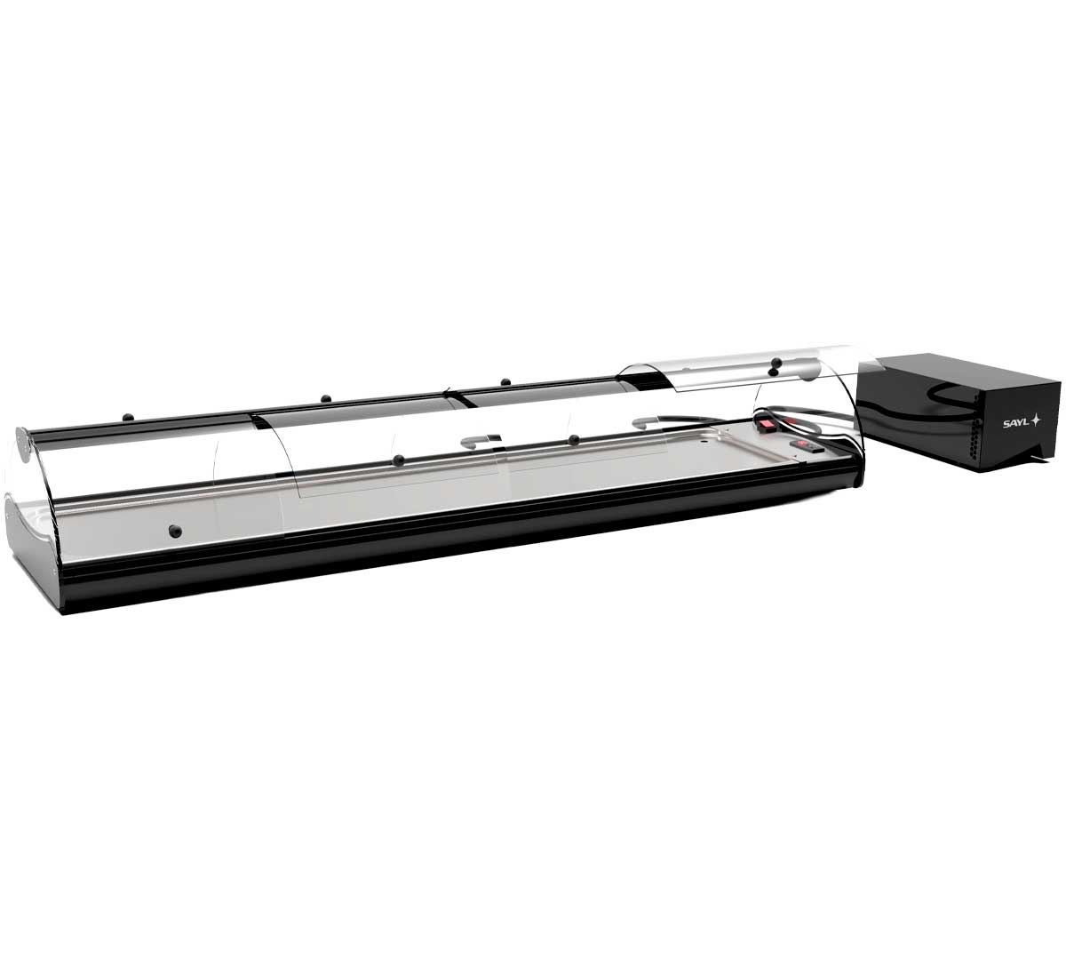 La Vitrina Refrigerada Self Service Grupo Remoto Cuba Plana de Sayl incluye el grupo frigorífico y cable de 2 metros. El motor no está dentro de la vitrina. Es un motor externo por lo que es ideal para optimizar el espacio en zonas reducidas.